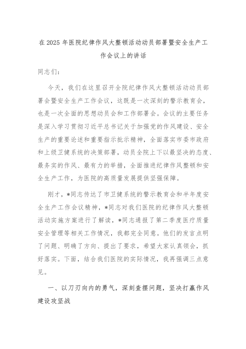 在2025年医院纪律作风大整顿活动动员部署暨安全生产工作会议上的讲话同志们:今天,我们在这里召开全院纪律作风大整顿活动动员部署会暨安全生产工作会议,这既是一次深刻的警示教育会,也是一次全面的思想动员会和工作部署会。会议的主要任务是深入学习贯彻习近平总书记关于加强党的作风建设、安全生产的重要论述和重要指示批示精神,全面落实市委市政府和上级卫健系统的决策部署,动员全院上下以最坚决的态度、最务实的作风、最有力的举措,全面推进纪律作风整顿和安全生产工作,为医院的高质量发展提供坚强保障。刚才,*同志传达了市卫健系统的警示教育会和半年度安全生产工作会议精神,*同志对我们医院的纪律作风大整顿活动实施方案进行了解读,*同志通报了第二季度医疗质量安全管理等相关工作情况,我都完全同意。他们的发言点明了问题、明确了方向、提出了要求,希望大家认真领会,抓好落实。下面,结合我们医院的实际情况,我再强调三点意见。一、以刀刃向内的勇气,深刻查摆问题,坚决打赢作风建设攻坚战