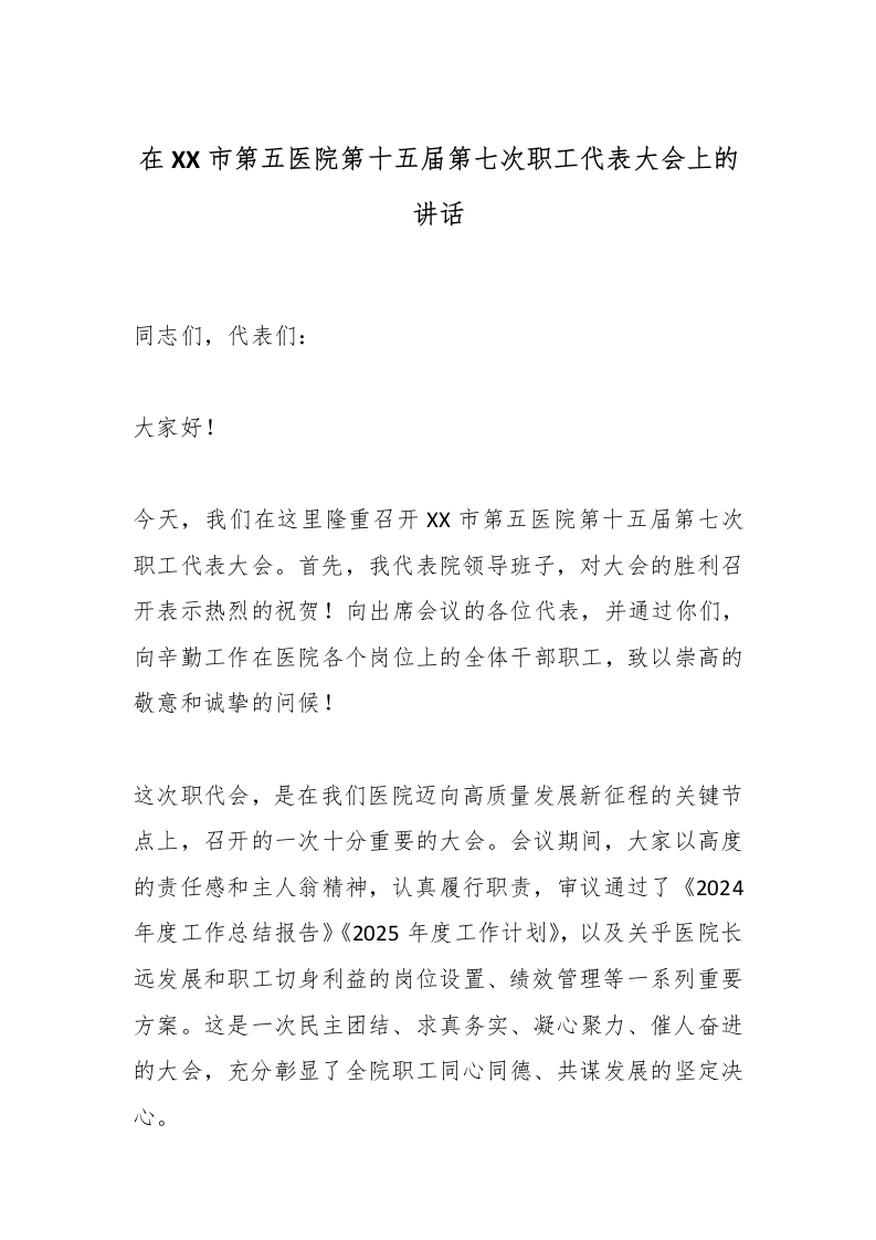 在X市第五医院第十五届第七次职工代表大会上的讲话同志们,代表们:大家好!今天,我们在这里隆重召开X市第五医院第十五届第七次职工代表大会。首先,我代表院领导班子,对大会的胜利召开表示热烈的祝贺!向出席会议的各位代表,并通过你们,向辛勤工作在医院各个岗位上的全体干部职工,致以崇高的敬意和诚挚的问候!这次职代会,是在我们医院迈向高质量发展新征程的关键节点上,召开的一次十分重要的大会。会议期间,大家以高度的责任感和主人翁精神,认真履行职责,审议通过了《2024年度工作总结报告》《2025年度工作计划》,以及关乎医院长远发展和职工切身利益的岗位设置、绩效管理等一系列重要方案。这是一次民主团结、求真务实、凝心聚力、催人奋进的大会,充分彰显了全院职工同心同德、共谋发展的坚定决心。