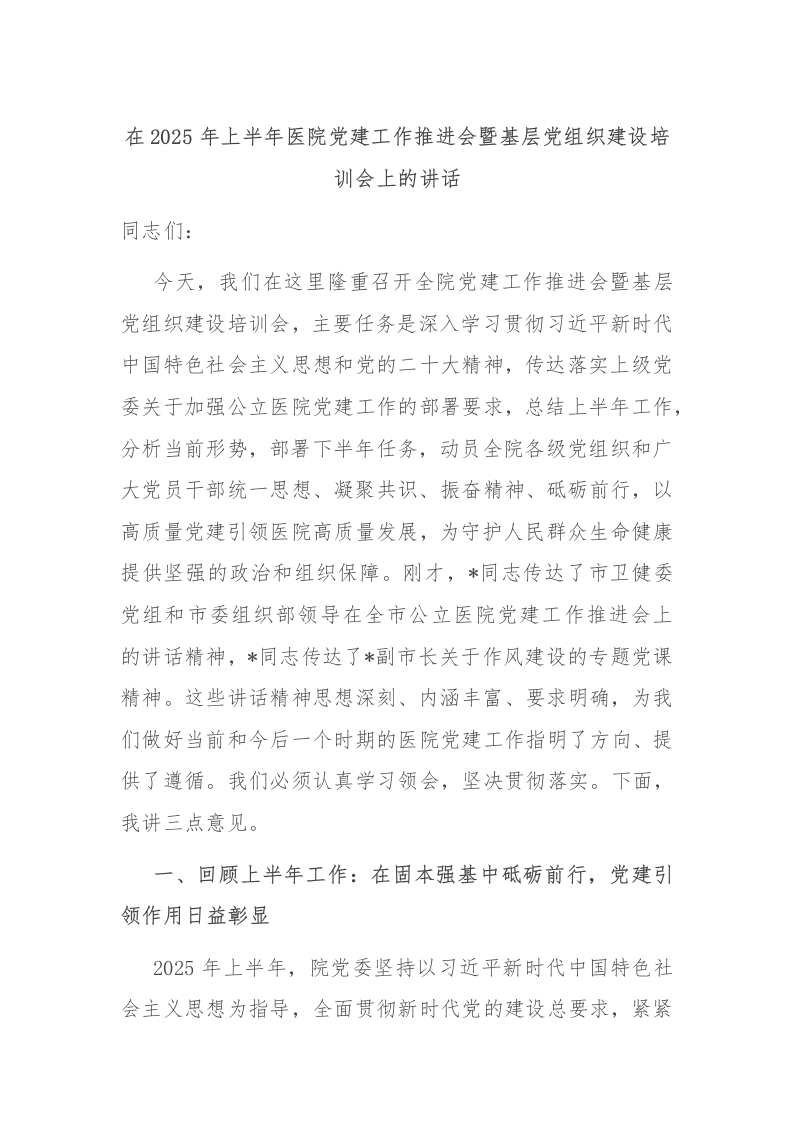 在2025年上半年医院党建工作推进会暨基层党组织建设培训会上的讲话同志们:今天,我们在这里隆重召开全院党建工作推进会暨基层党组织建设培训会,主要任务是深入学习贯彻习近平新时代中国特色社会主义思想和党的二十大精神,传达落实上级党委关于加强公立医院党建工作的部署要求,总结上半年工作,分析当前形势,部署下半年任务,动员全院各级党组织和广大党员干部统一思想、凝聚共识、振奋精神、砥砺前行,以高质量党建引领医院高质量发展,为守护人民群众生命健康提供坚强的政治和组织保障。刚才,*同志传达了市卫健委党组和市委组织部领导在全市公立医院党建工作推进会上的讲话精神,*同志传达了*副市长关于作风建设的专题党课精神。这些讲话精神思想深刻、内涵丰富、要求明确,为我们做好当前和今后一个时期的医院党建工作指明了方向、提供了遵循。我们必须认真学习领会,坚决贯彻落实。下面,我讲三点意见。一、回顾上半年工作:在固本强基中砥砺前行,党建引领作用日益彰显2025年上半年,院党委坚持以习近平新时代中国特色社会主义思想为指导,全面贯彻新时代党的建设总要求,紧紧