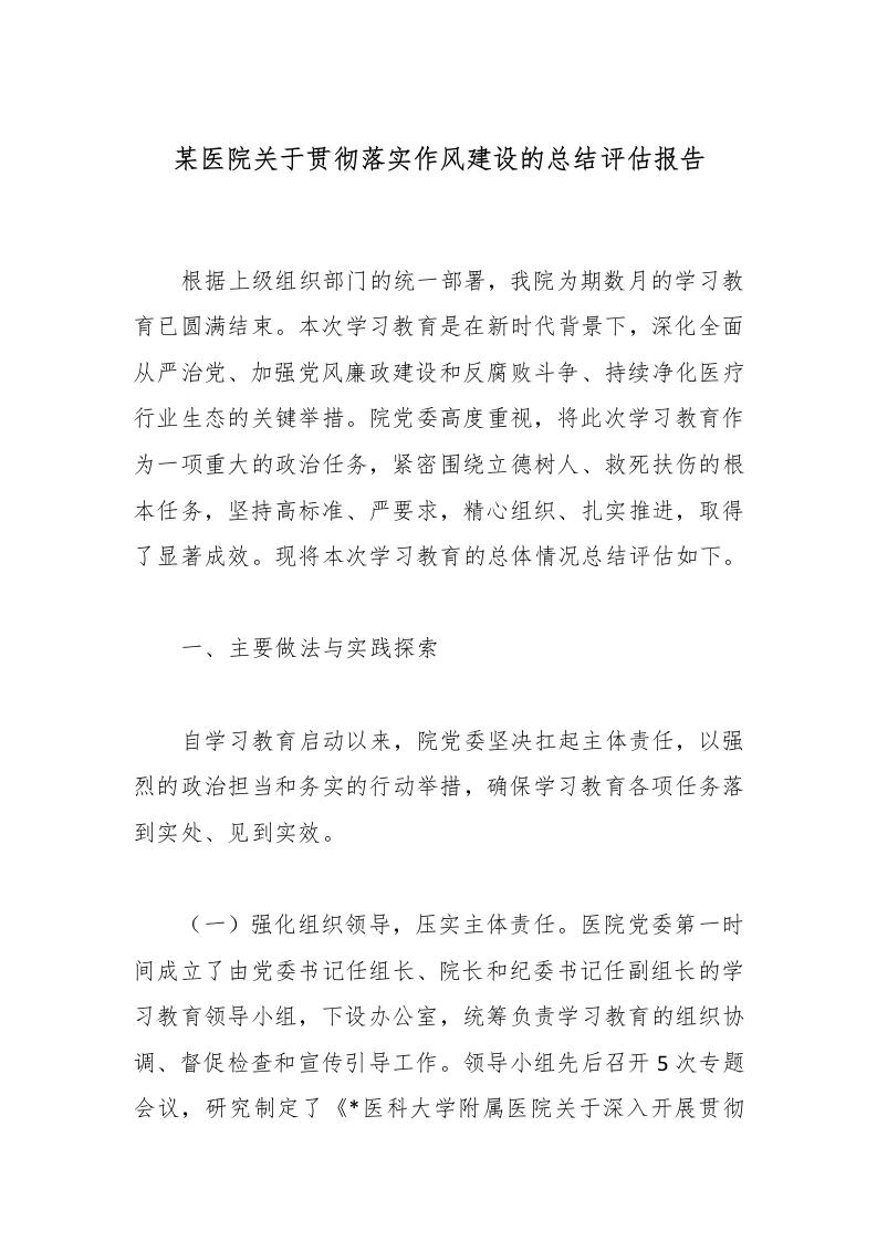 某医院关于贯彻落实作风建设的总结评估报告根据上级组织部门的统一部署,我院为期数月的学习教育已圆满结束。本次学习教育是在新时代背景下,深化全面从严治党、加强党风廉政建设和反腐败斗争、持续净化医疗行业生态的关键举措。院党委高度重视,将此次学习教育作为一项重大的政治任务,紧密围绕立德树人、救死扶伤的根本任务,坚持高标准、严要求,精心组织、扎实推进,取得了显著成效。现将本次学习教育的总体情况总结评估如下。一、主要做法与实践探索自学习教育启动以来,院党委坚决扛起主体责任,以强烈的政治担当和务实的行动举措,确保学习教育各项任务落到实处、见到实效。(一)强化组织领导,压实主体责任。医院党委第一时间成立了由党委书记任组长、院长和纪委书记任副组长的学习教育领导小组,下设办公室,统筹负责学习教育的组织协调、督促检查和宣传引导工作。领导小组先后召开5次专题会议,研究制定了《*医科大学附属医院关于深入开展贯彻