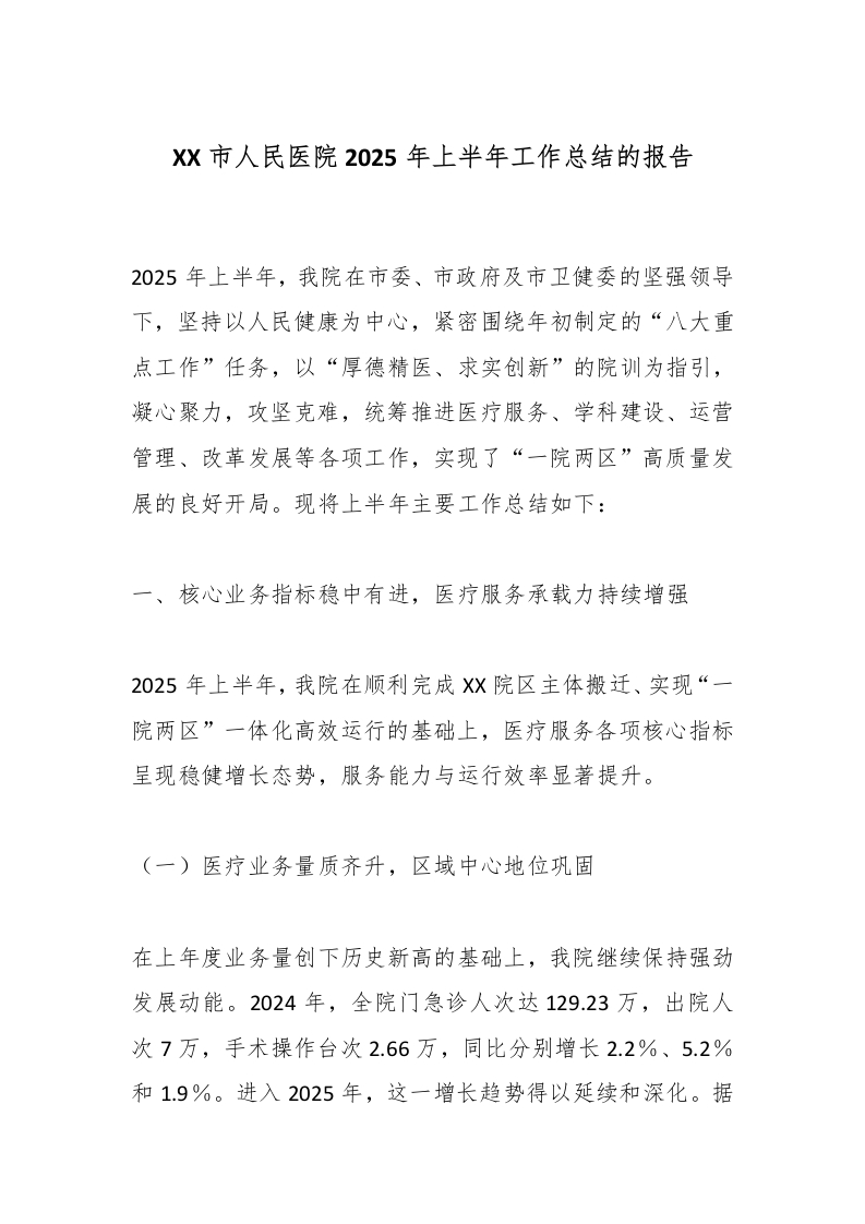 XX市人民医院2025年上半年工作总结的报告2025年上半年,我院在市委、市政府及市卫健委的坚强领导下,坚持以人民健康为中心,紧密围绕年初制定的“八大重点工作”任务,以“厚德精医、求实创新”的院训为指引,凝心聚力,攻坚克难,统筹推进医疗服务、学科建设、运营管理、改革发展等各项工作,实现了“一院两区”高质量发展的良好开局。现将上半年主要工作总结如下:一、核心业务指标稳中有进,医疗服务承载力持续增强2025年上半年,我院在顺利完成XX院区主体搬迁、实现“一院两区”一体化高效运行的基础上,医疗服务各项核心指标呈现稳健增长态势,服务能力与运行效率显著提升。(一)医疗业务量质齐升,区域中心地位巩固在上年度业务量创下历史新高的基础上,我院继续保持强劲发展动能。2024年,全院门急诊人次达129.23万,出院人次7万,手术操作台次2.66万,同比分别增长2.2%、5.2%和1.9%。进入2025年,这一增长趋势得以延续和深化。据