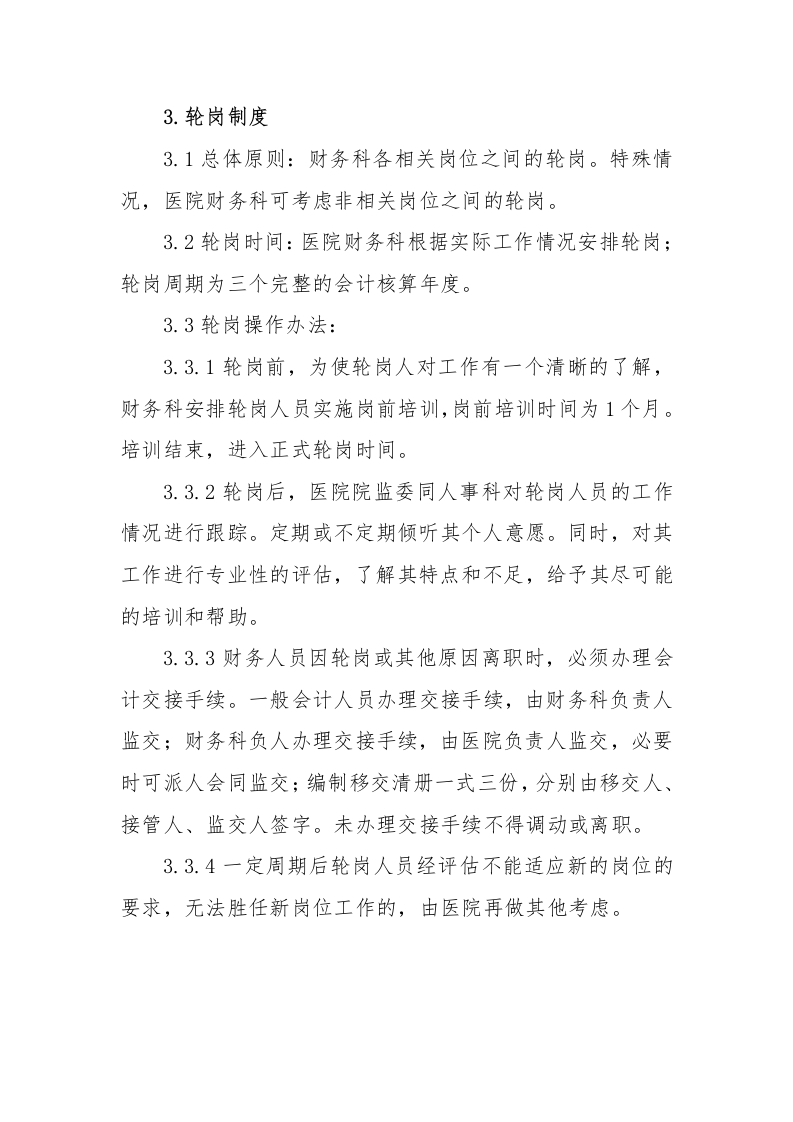 3.轮岗制度3.1总体原则:财务科各相关岗位之间的轮岗。特殊情况,医院财务科可考虑非相关岗位之间的轮岗。3.2轮岗时间:医院财务科根据实际工作情况安排轮岗:轮岗周期为三个完整的会计核算年度。3.3轮岗操作办法:3.3.1轮岗前,为使轮岗人对工作有一个清晰的了解,财务科安排轮岗人员实施岗前培训,岗前培训时间为1个月。培训结束,进入正式轮岗时间。3.3.2轮岗后,医院院监委同人事科对轮岗人员的工作情况进行跟踪。定期或不定期倾听其个人意愿。同时,对其工作进行专业性的评估,了解其特点和不足,给予其尽可能的培训和帮助。3.3.3财务人员因轮岗或其他原因离职时,必须办理会计交接手续。一般会计人员办理交接手续,由财务科负责人监交;财务科负人办理交接手续,由医院负责人监交,必要时可派人会同监交;编制移交清册一式三份,分别由移交人、接管人、监交人签字。未办理交接手续不得调动或离职。3.3.4一定周期后轮岗人员经评估不能适应新的岗位的要求,无法胜任新岗位工作的,由医院再做其他考虑。