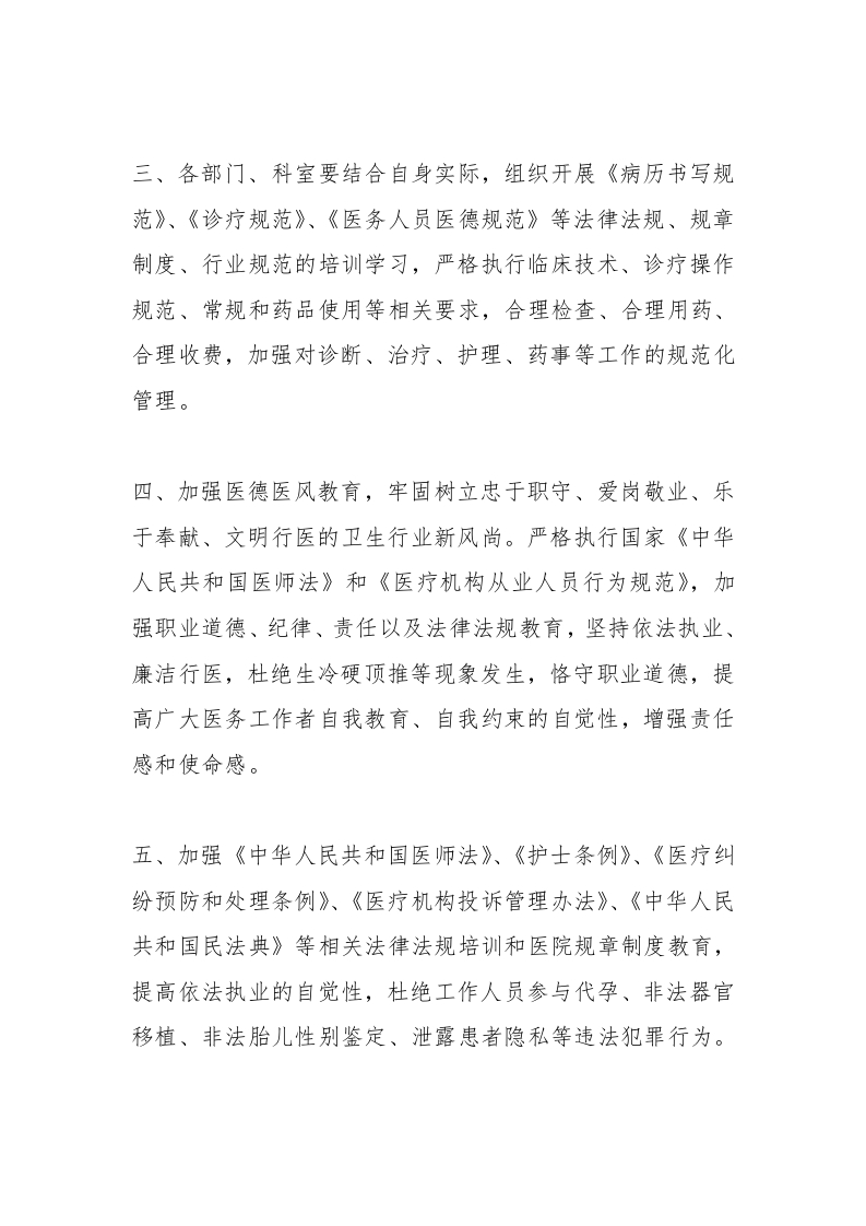 三、各部门、科室要结合自身实际,组织开展《病历书写规范》、《诊疗规范》、《医务人员医德规范》等法律法规、规章制度、行业规范的培训学习,严格执行临床技术、诊疗操作规范、常规和药品使用等相关要求,合理检查、合理用药、合理收费,加强对诊断、治疗、护理、药事等工作的规范化管理。四、加强医德医风教育,牢固树立忠于职守、爱岗敬业、乐于奉献、文明行医的卫生行业新风尚。严格执行国家《中华人民共和国医师法》和《医疗机构从业人员行为规范》,加强职业道德、纪律、责任以及法律法规教育,坚持依法执业、廉洁行医,杜绝生冷硬顶推等现象发生,恪守职业道德,提高广大医务工作者自我教育、自我约束的自觉性,增强责任感和使命感。五、加强《中华人民共和国医师法》、《护士条例》、《医疗纠纷预防和处理条例》、《医疗机构投诉管理办法》、《中华人民共和国民法典》等相关法律法规培训和医院规章制度教育,提高依法执业的自觉性,杜绝工作人员参与代孕、非法器官移植、非法胎儿性别鉴定、泄露患者隐私等违法犯罪行为。