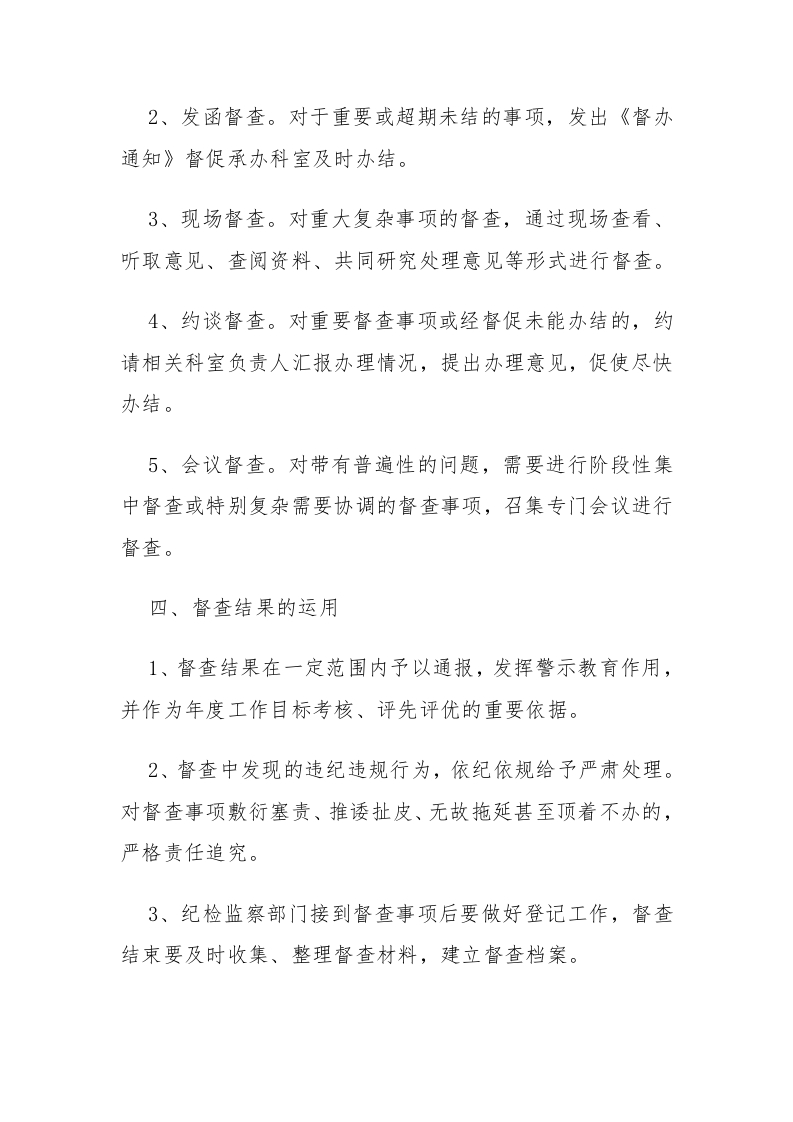 2、发函督查。对于重要或超期未结的事项,发出《督办通知》督促承办科室及时办结。3、现场督查。对重大复杂事项的督查,通过现场查看、听取意见、查阅资料、共同研究处理意见等形式进行督查。4、约谈督查。对重要督查事项或经督促未能办结的,约请相关科室负责人汇报办理情况,提出办理意见,促使尽快办结。5、会议督查。对带有普遍性的问题,需要进行阶段性集中督查或特别复杂需要协调的督查事项,召集专门会议进行督查。四、督查结果的运用1、督查结果在一定范围内予以通报,发挥警示教育作用,并作为年度工作目标考核、评先评优的重要依据。2、督查中发现的违纪违规行为,依纪依规给予严肃处理。对督查事项敷衍塞责、推诿扯皮、无故拖延甚至顶着不办的,严格责任追究。3、纪检监察部门接到督查事项后要做好登记工作,督查结束要及时收集、整理督查材料,建立督查档案。