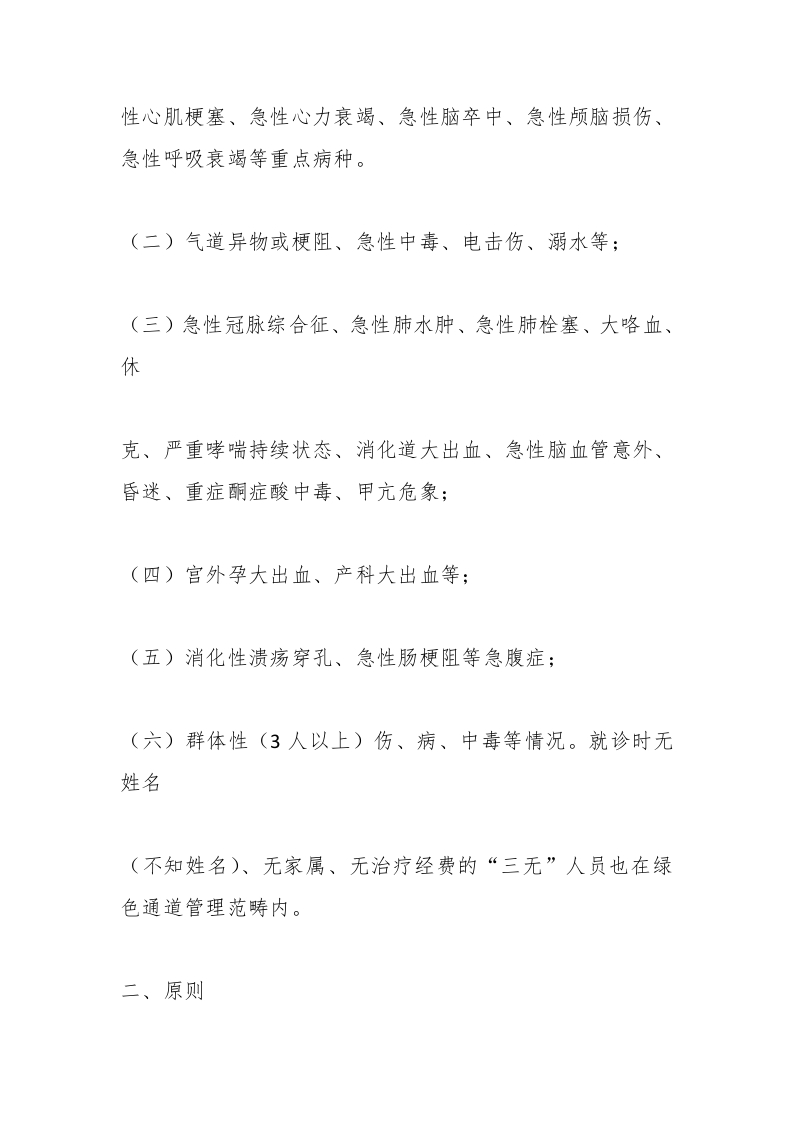 XX县中医院急诊手术绿色通道管理制度与流程医用文库3个月前发布关注私信12.96KB7页02012XX县中医院急诊手术绿色通道管理制度与流程此内容为付费资源,请付费后查看¥29黄金会员免费立即购买您当前未登录!建议登陆后购买,可保存购买订单付费资源已售 12 第1页 / 共7页 第2页 / 共7页 试读已结束,还剩5页,您可下载完整版后进行离线阅读 © 版权声明© 本站内容版权归原作者所有。 本站仅为信息存储平台,不对文章观点负责,请谨慎甄别。 禁止任何形式的商业用途!如有侵权,请联系我们,将于7日内处理。 站如收取任何费用(例如会员费、下载费等),均仅为维持服务器运营、带宽及数据存储所产生的成本费用,并非对版权内容的售卖或商业授权,特此说明。 THE END管理制度 文本预览 性心肌梗塞、急性心力衰竭、急性脑卒中、急性颅脑损伤、急性呼吸衰竭等重点病种。(二)气道异物或梗阻、急性中毒、电击伤、溺水等;(三)急性冠脉综合征、急性肺水肿、急性肺栓塞、大咯血、休克、严重哮喘持续状态、消化道大出血、急性脑血管意外、昏迷、重症酮症酸中毒、甲亢危象;(四)宫外孕大出血、产科大出血等:(五)消化性溃疡穿孔、急性肠梗阻等急腹症;(六)群体性(3人以上)伤、病、中毒等情况。就诊时无姓名(不知姓名)、无家属、无治疗经费的“三无”人员也在绿色通道管理范畴内。二、原则 查看更多 收起部分 喜欢就支持一下吧点赞12 分享QQ空间微博QQ好友海报分享复制链接收藏