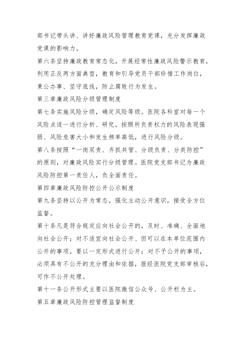 部书记带头讲、讲好廉政风险管理教育党课,充分发挥廉政党课的影响力。第六条坚持廉政教育常态化,开展经常性廉政风险警示教育,利用正反两方面典型,教育和引导党员干部珍惜工作岗位,秉公办事、坚守底线,防止腐败行为发生。第三章廉政风险分级管理制度第七条实施风险分级,确定风险等级。医院各科室对每一个风险点逐一进行分析、研究,按照所负责权力的风险表现强弱、风险危害大小和发生频率高低,进行风险分级。第八条按照“一岗双责、齐抓共管、分级负责、分类防控”的原则,对廉政风险实行分级管理。医院党支部书记为廉政风险防控第一责任人,负全面责任。第四章廉政风险防控公开公示制度第九条坚持以公开为常态,强化主动公开意识,接受全方位监督。第十条凡是符合规定应向社会公开的,及时、准确、全面地向社会公开;对不适宜向社会公开、但可以在本单位范围内公开的事项,要以一定形式进行公开;对不予公开的事项,必须具有不公开的充分理由和依据,报经医院党支部审核后,可作不公开处理。第十一条公开形式主要以医院微信公众号、公开栏为主。第五章廉政风险防控管理监督制度