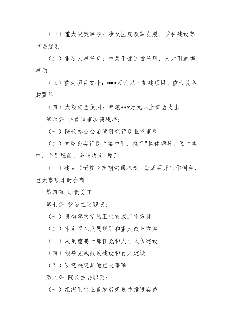 (一)重大决策事项:涉及医院改革发展、学科建设等重要规划(二)重要人事任免:中层干部选拔任用、人才引进等事项(三)重大项目安排:**万元以上基建项目、重大设备购置等(四)大额资金使用:单笔**万元以上资金支出第六条完善议事决策程序:(一)院长办公会前置研究行政业务事项(二)党委会实行民主集中制,执行"集体领导、民主集中、个别酝酿、会议决定"原则(三)建立书记院长定期沟通机制,每周召开工作例会,重大事项即时会商第四章职责分工第七条党委主要职责:(一)贯彻落实党的卫生健康工作方针(二)审定医院发展规划和重大改革方案(三)决定重要干部任免和人才队伍建设(四)领导党风廉政建设和行风建设(五)研究决定其他重大事项第八条院长主要职责:(一)组织制定业务发展规划并推进实施