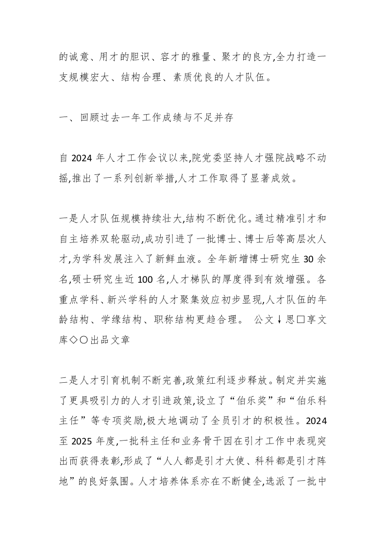 的诚意、用才的胆识、容才的雅量、聚才的良方,全力打造一支规模宏大、结构合理、素质优良的人才队伍。一、回顾过去一年工作成绩与不足并存自2024年人才工作会议以来,院党委坚持人才强院战略不动摇,推出了一系列创新举措,人才工作取得了显著成效。一是人才队伍规模持续壮大,结构不断优化。通过精准引才和自主培养双轮驱动,成功引进了一批博士、博士后等高层次人才,为学科发展注入了新鲜血液。全年新增博士研究生30余名,硕士研究生近100名,人才梯队的厚度得到有效增强。各重点学科、新兴学科的人才聚集效应初步显现,人才队伍的年龄结构、学缘结构、职称结构更趋合理。公文↓思口享文库◇O出品文章二是人才引育机制不断完善,政策红利逐步释放。制定并实施了更具吸引力的人才引进政策,设立了“伯乐奖”和“伯乐科主任”等专项奖励,极大地调动了全员引才的积极性。2024至2025年度,一批科主任和业务骨干因在引才工作中表现突出而获得表彰,形成了“人人都是引才大使、科科都是引才阵地”的良好氛围。人才培养体系亦在不断健全,选派了一批中