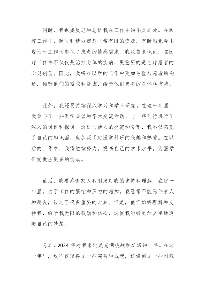 同时,我也要反思和总结我在工作中的不足之处。在医疗工作中,时间和精力都是非常有限的资源,有时难免会出现忙于工作而忽视了患者的情感需求。我深刻意识到,在医疗工作中不仅仅是治疗身体的疾病,更重要的是治疗患者的心灵创伤。因此,我将在以后的工作中更加注重与患者的沟通,倾听他们的需求和疑虑,给予他们更多的关怀和支持。此外,我还要持续深入学习和学术研究。在这一年里,我参与了一些医学会议和学术交流活动,与一些同行进行了深入的讨论和探讨。通过与他人的交流和分享,我不仅拓宽了自己的知识面,也加深了对医学科研的兴趣和热爱。在以后的工作中,我将继续努力,提高自己的学术水平,为医学研究做出更多的贡献。最后,我要感谢家人和朋友对我的支持和理解。在这一年里,由于工作的繁忙和压力的增加,我经常不能陪伴家人和朋友,错过了很多重要的时刻。但是,他们始终理解和支持我,给予我无限的鼓励和信心,这使我能够更加坚定地追随自己的梦想。总之,2024年对我来说是充满挑战和机遇的一年。在这一年里,我不仅取得了一些突破和成就,还遇到了一些困难