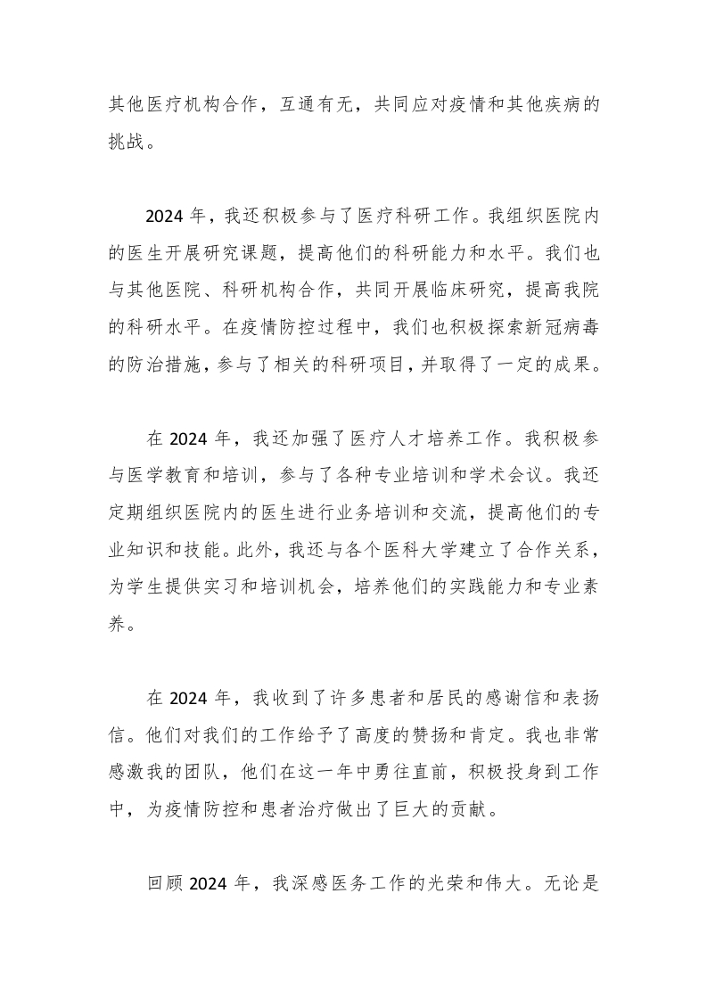 其他医疗机构合作,互通有无,共同应对疫情和其他疾病的挑战。2024年,我还积极参与了医疗科研工作。我组织医院内的医生开展研究课题,提高他们的科研能力和水平。我们也与其他医院、科研机构合作,共同开展临床研究,提高我院的科研水平。在疫情防控过程中,我们也积极探索新冠病毒的防治措施,参与了相关的科研项目,并取得了一定的成果。在2024年,我还加强了医疗人才培养工作。我积极参与医学教育和培训,参与了各种专业培训和学术会议。我还定期组织医院内的医生进行业务培训和交流,提高他们的专业知识和技能。此外,我还与各个医科大学建立了合作关系,为学生提供实习和培训机会,培养他们的实践能力和专业素养。在2024年,我收到了许多患者和居民的感谢信和表扬信。他们对我们的工作给予了高度的赞扬和肯定。我也非常感激我的团队,他们在这一年中勇往直前,积极投身到工作中,为疫情防控和患者治疗做出了巨大的贡献。回顾2024年,我深感医务工作的光荣和伟大。无论是