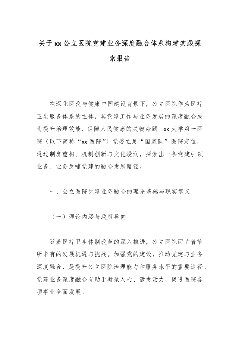 关于x公立医院党建业务深度融合体系构建实践探索报告在深化医改与健康中国建设背景下,公立医院作为医疗卫生服务体系的主体,其党建工作与业务发展的深度融合成为提升治理效能、保障人民健康的关键命题。x大学第一医院(以下简称“x医院”)党委立足“国家队”医院定位,通过制度重构、机制创新与文化浸润,探索出一条党建引领业务、业务反哺党建的融合发展路径。一、公立医院党建业务融合的理论基础与现实意义(一)理论内涵与政策导向随着医疗卫生体制改革的深入推进,公立医院面临着前所未有的发展机遇与挑战。加强党的建设,推动党建与业务深度融合,是提升公立医院治理能力和服务水平的重要途径。党建业务深度融合有助于凝聚人心、激发活力,促进医院各项事业全面发展。