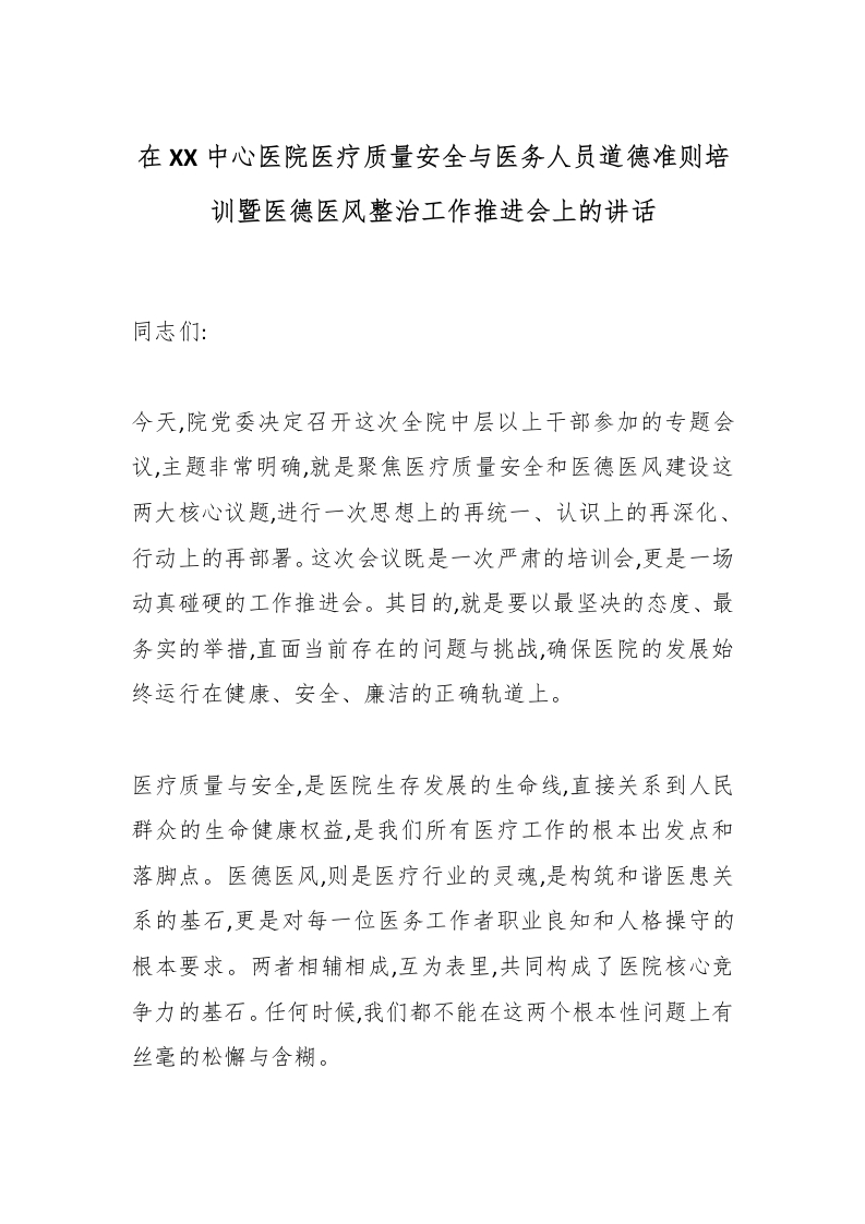 在X中心医院医疗质量安全与医务人员道德准则培训暨医德医风整治工作推进会上的讲话同志们:今天,院党委决定召开这次全院中层以上干部参加的专题会议,主题非常明确,就是聚焦医疗质量安全和医德医风建设这两大核心议题,进行一次思想上的再统一、认识上的再深化、行动上的再部署。这次会议既是一次严肃的培训会,更是一场动真碰硬的工作推进会。其目的,就是要以最坚决的态度、最务实的举措,直面当前存在的问题与挑战,确保医院的发展始终运行在健康、安全、廉洁的正确轨道上。医疗质量与安全,是医院生存发展的生命线,直接关系到人民群众的生命健康权益,是我们所有医疗工作的根本出发点和落脚点。医德医风,则是医疗行业的灵魂,是构筑和谐医患关系的基石,更是对每一位医务工作者职业良知和人格操守的根本要求。两者相辅相成,互为表里,共同构成了医院核心竞争力的基石。任何时候,我们都不能在这两个根本性问题上有丝毫的松懈与含糊。