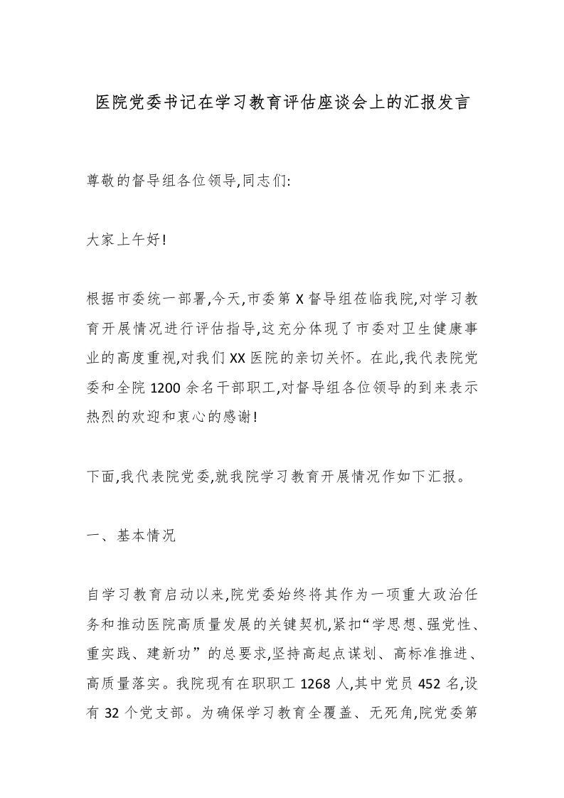 医院党委书记在学习教育评估座谈会上的汇报发言尊敬的督导组各位领导,同志们:大家上午好!根据市委统一部署,今天,市委第X督导组莅临我院,对学习教育开展情况进行评估指导,这充分体现了市委对卫生健康事业的高度重视,对我们X医院的亲切关怀。在此,我代表院党委和全院1200余名干部职工,对督导组各位领导的到来表示热烈的欢迎和衷心的感谢!下面,我代表院党委,就我院学习教育开展情况作如下汇报。一、基本情况自学习教育启动以来,院党委始终将其作为一项重大政治任务和推动医院高质量发展的关键契机,紧扣“学思想、强党性、重实践、建新功”的总要求,坚持高起点谋划、高标准推进、高质量落实。我院现有在职职工1268人,其中党员452名,设有32个党支部。为确保学习教育全覆盖、无死角,院党委第