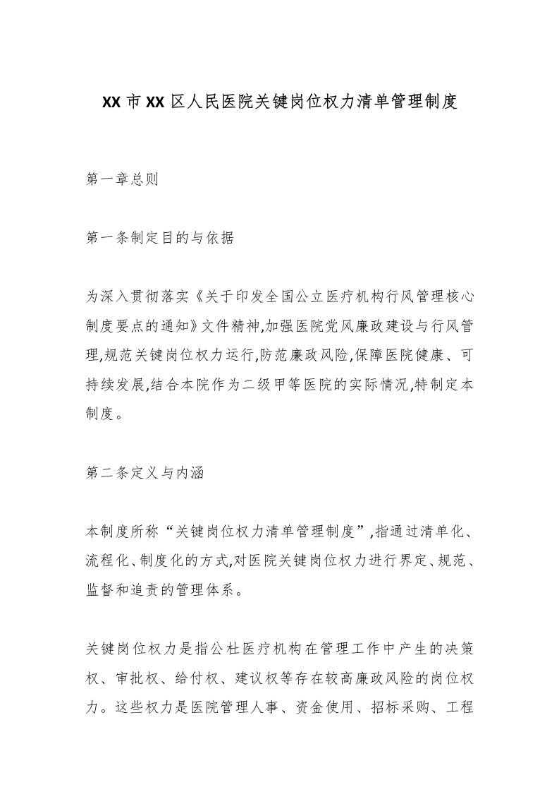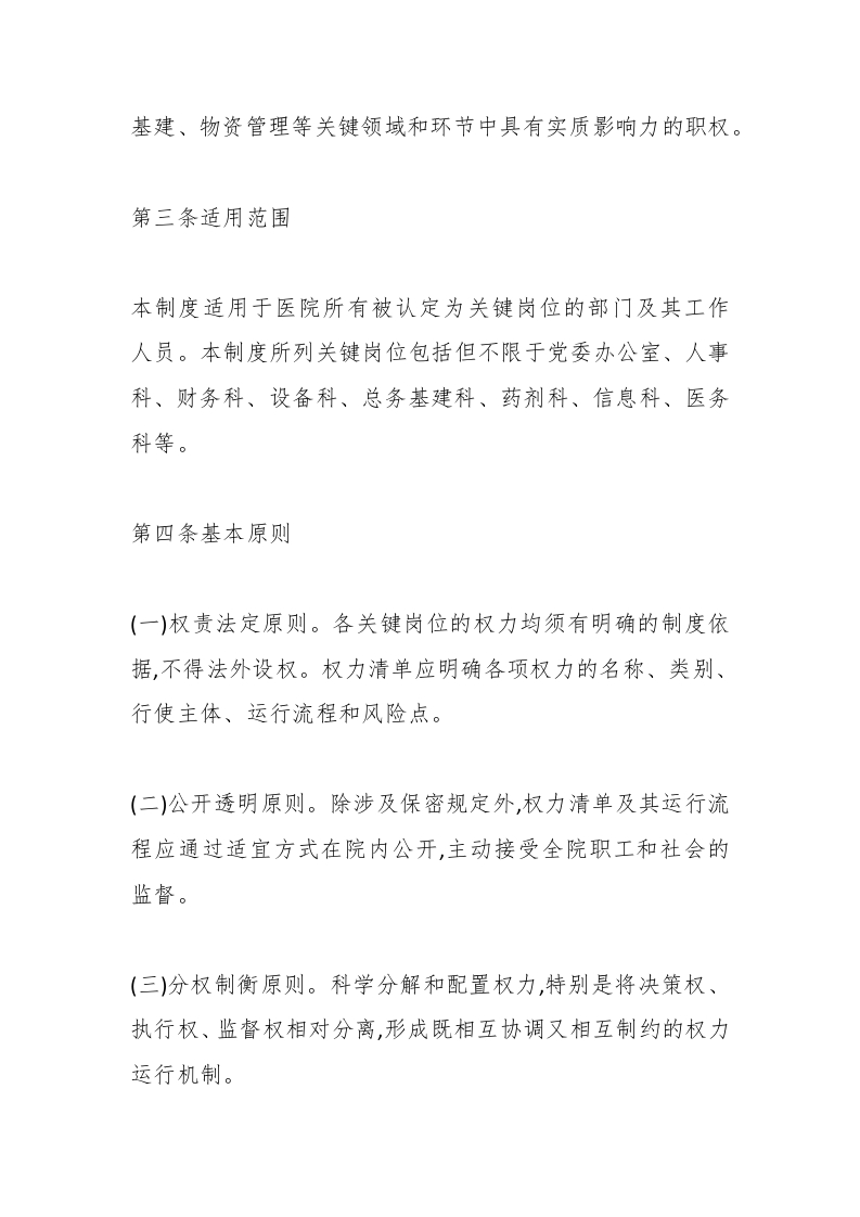 基建、物资管理等关键领域和环节中具有实质影响力的职权。第三条适用范围本制度适用于医院所有被认定为关键岗位的部门及其工作人员。本制度所列关键岗位包括但不限于党委办公室、人事科、财务科、设备科、总务基建科、药剂科、信息科、医务科等。第四条基本原则(一)权责法定原则。各关键岗位的权力均须有明确的制度依据,不得法外设权。权力清单应明确各项权力的名称、类别、行使主体、运行流程和风险点。(二)公开透明原则。除涉及保密规定外,权力清单及其运行流程应通过适宜方式在院内公开,主动接受全院职工和社会的监督。(三)分权制衡原则。科学分解和配置权力,特别是将决策权、执行权、监督权相对分离,形成既相互协调又相互制约的权力运行机制。