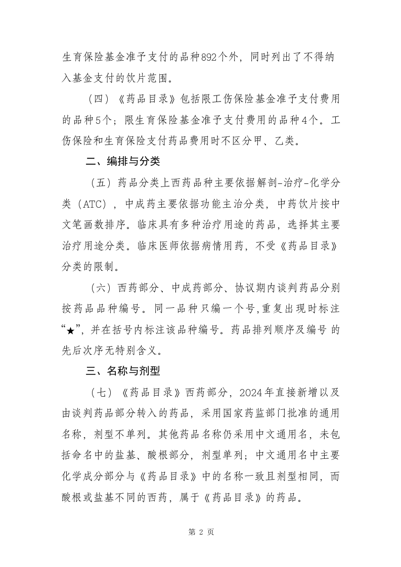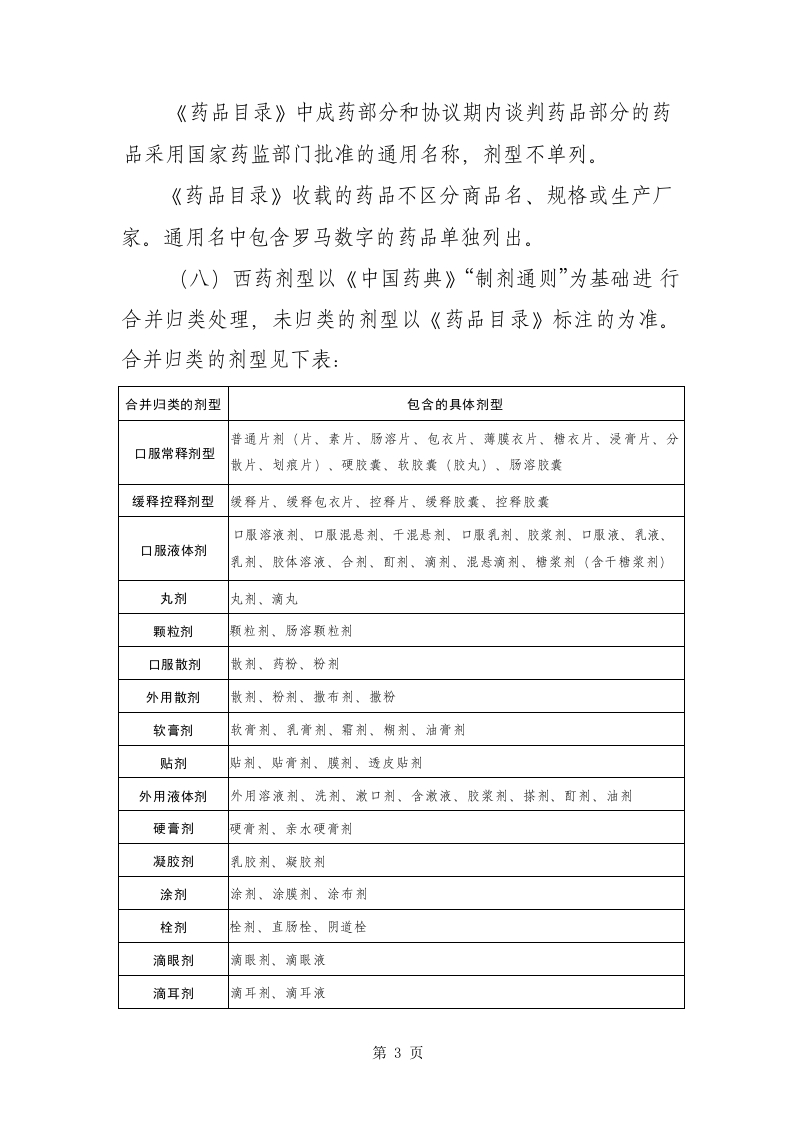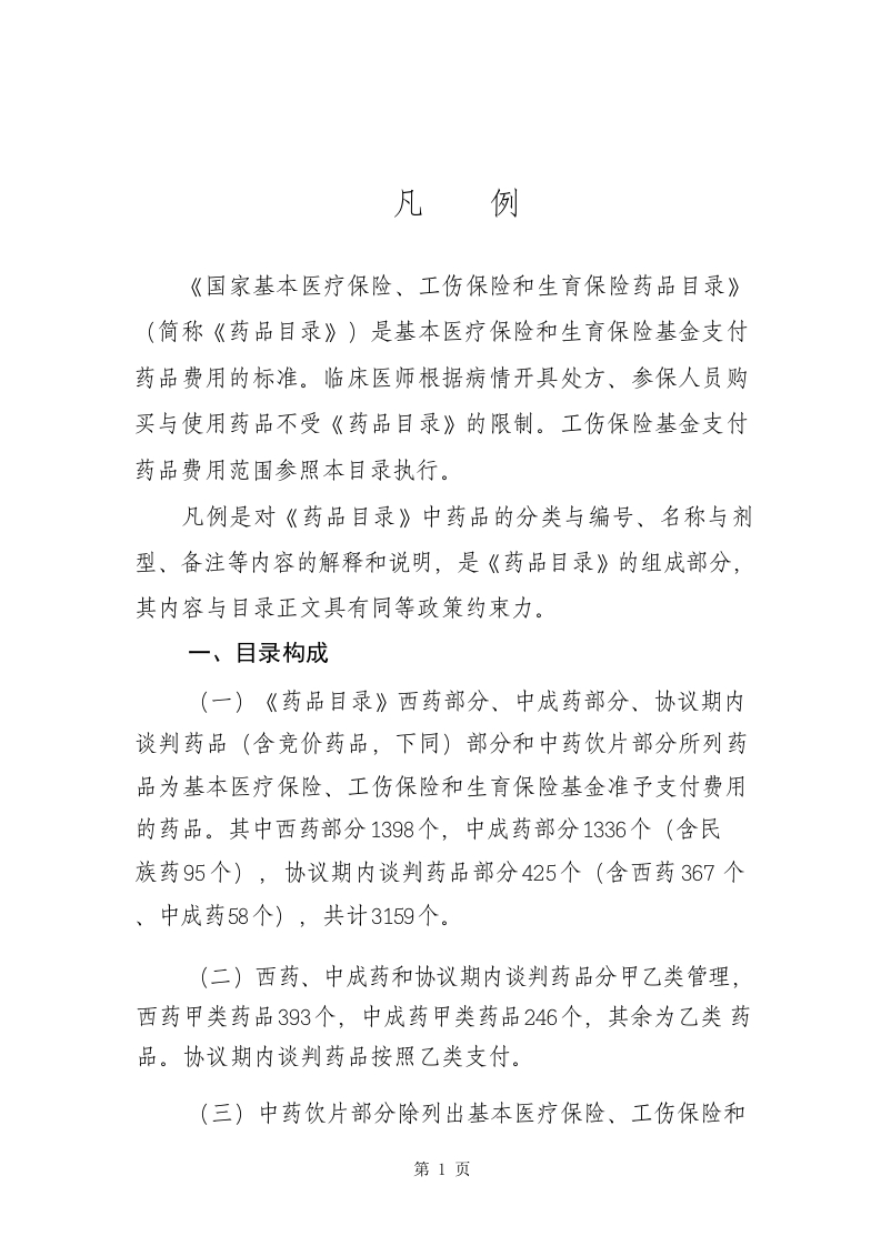 凡例《国家基本医疗保险、工伤保险和生育保险药品目录》(简称《药品目录》)是基本医疗保险和生育保险基金支付药品费用的标准。临床医师根据病情开具处方、参保人员购买与使用药品不受《药品目录》的限制。工伤保险基金支付药品费用范围参照本目录执行。凡例是对《药品目录》中药品的分类与编号、名称与剂型、备注等内容的解释和说明,是《药品目录》的组成部分,其内容与目录正文具有同等政策约束力。一、目录构成(一)《药品目录》西药部分、中成药部分、协议期内谈判药品(含竞价药品,下同)部分和中药饮片部分所列药品为基本医疗保险、工伤保险和生育保险基金准予支付费用的药品。其中西药部分1398个,中成药部分1336个(含民族药95个),协议期内谈判药品部分425个(含西药367个、中成药58个),共计3159个。(二)西药、中成药和协议期内谈判药品分甲乙类管理,西药甲类药品393个,中成药甲类药品246个,其余为乙类药品。协议期内谈判药品按照乙类支付。(三)中药饮片部分除列出基本医疗保险、工伤保险和第1页
