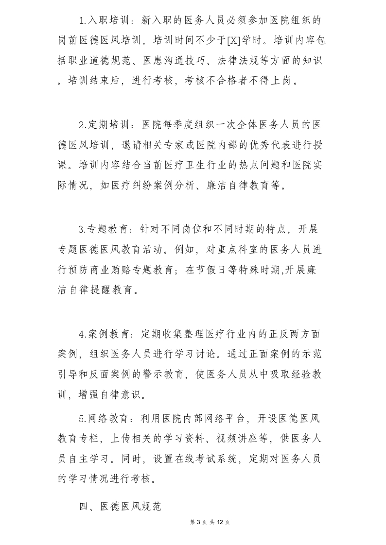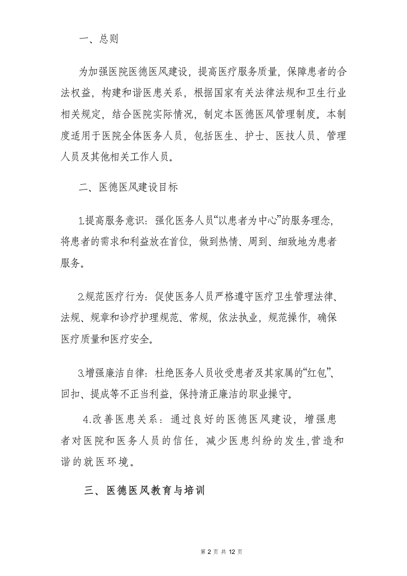 一、总则为加强医院医德医风建设,提高医疗服务质量,保障患者的合法权益,构建和谐医患关系,根据国家有关法律法规和卫生行业相关规定,结合医院实际情况,制定本医德医风管理制度。本制度适用于医院全体医务人员,包括医生、护士、医技人员、管理人员及其他相关工作人员。二、医德医风建设目标1.提高服务意识:强化医务人员“以患者为中心”的服务理念,将患者的需求和利益放在首位,做到热情、周到、细致地为患者服务。2规范医疗行为:促使医务人员严格遵守医疗卫生管理法律、法规、规章和诊疗护理规范、常规,依法执业,规范操作,确保医疗质量和医疗安全。3增强廉洁自律:杜绝医务人员收受患者及其家属的“红包”、回扣、提成等不正当利益,保持清正廉洁的职业操守。4.改善医患关系:通过良好的医德医风建设,增强患者对医院和医务人员的信任,减少医患纠纷的发生,营造和谐的就医环境。三、医德医风教育与培训第2页共12页