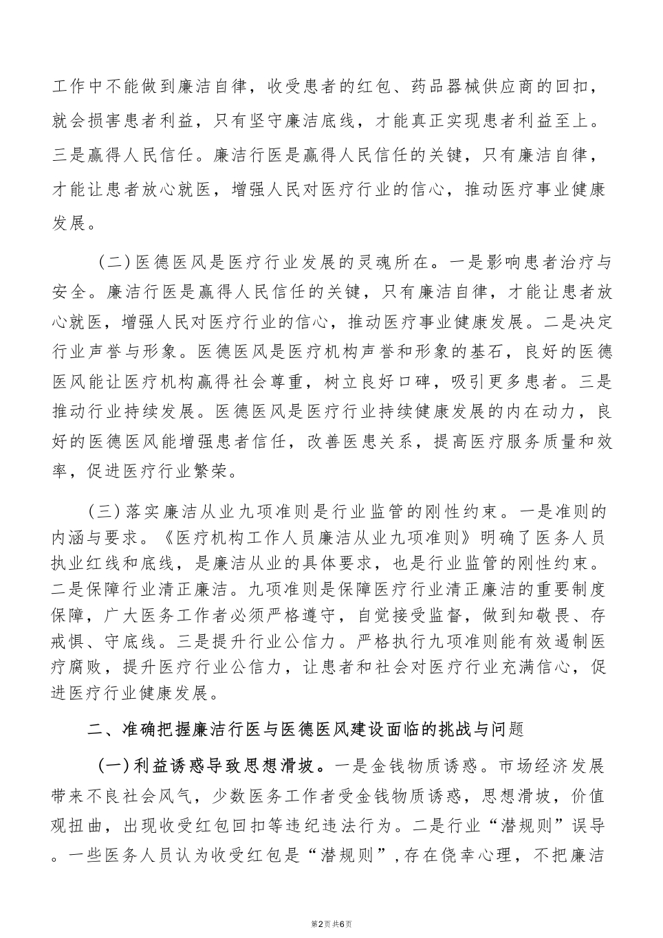 工作中不能做到廉洁自律,收受患者的红包、药品器械供应商的回扣,就会损害患者利益,只有坚守廉洁底线,才能真正实现患者利益至上。三是赢得人民信任。廉洁行医是赢得人民信任的关键,只有廉洁自律,才能让患者放心就医,增强人民对医疗行业的信心,推动医疗事业健康发展。(二)医德医风是医疗行业发展的灵魂所在。一是影响患者治疗与安全。廉洁行医是赢得人民信任的关键,只有廉洁自律,才能让患者放心就医,增强人民对医疗行业的信心,推动医疗事业健康发展。二是决定行业声誉与形象。医德医风是医疗机构声誉和形象的基石,良好的医德医风能让医疗机构赢得社会尊重,树立良好口碑,吸引更多患者。三是推动行业持续发展。医德医风是医疗行业持续健康发展的内在动力,良好的医德医风能增强患者信任,改善医患关系,提高医疗服务质量和效率,促进医疗行业繁荣。(三)落实廉洁从业九项准则是行业监管的刚性约束。一是准则的内涵与要求。《医疗机构工作人员廉洁从业九项准则》明确了医务人员执业红线和底线,是廉洁从业的具体要求,也是行业监管的刚性约束。二是保障行业清正廉洁。九项准则是保障医疗行业清正廉洁的重要制度保障,广大医务工作者必须严格遵守,自觉接受监督,做到知敬畏、存戒惧、守底线。三是提升行业公信力。严格执行九项准则能有效遏制医疗腐败,提升医疗行业公信力,让患者和社会对医疗行业充满信心,促进医疗行业健康发展。二、准确把握廉洁行医与医德医风建设面临的挑战与问题(一)利益诱惑导致思想滑坡。一是金钱物质诱惑。市场经济发展带来不良社会风气,少数医务工作者受金钱物质诱惑,思想滑坡,价值观扭曲,出现收受红包回扣等违纪违法行为。二是行业“潜规则”误导。一些医务人员认为收受红包是“潜规则”,存在侥幸心理,不把廉洁第2页共6页
