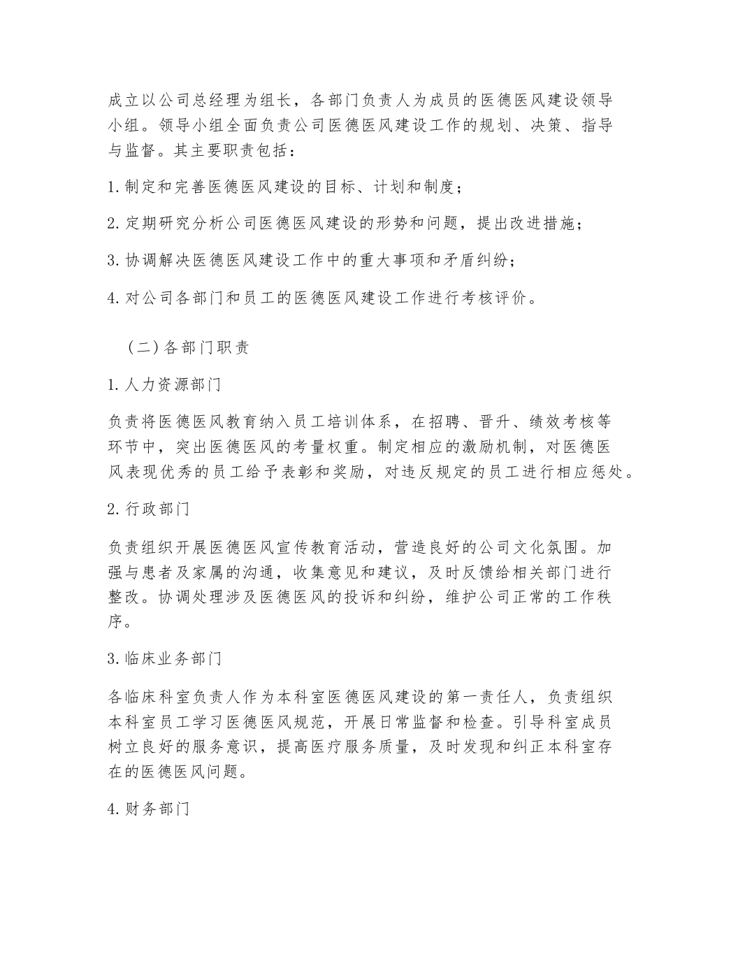 成立以公司总经理为组长,各部门负责人为成员的医德医风建设领导小组。领导小组全面负责公司医德医风建设工作的规划、决策、指导与监督。其主要职责包括:1.制定和完善医德医风建设的目标、计划和制度;2.定期研究分析公司医德医风建设的形势和问题,提出改进措施;3.协调解决医德医风建设工作中的重大事项和矛盾纠纷;4.对公司各部门和员工的医德医风建设工作进行考核评价。(二)各部门职责1.人力资源部门负责将医德医风教育纳入员工培训体系,在招聘、晋升、绩效考核等环节中,突出医德医风的考量权重。制定相应的激励机制,对医德医风表现优秀的员工给予表彰和奖励,对违反规定的员工进行相应惩处。2.行政部门负责组织开展医德医风宣传教育活动,营造良好的公司文化氛围。加强与患者及家属的沟通,收集意见和建议,及时反馈给相关部门进行整改。协调处理涉及医德医风的投诉和纠纷,维护公司正常的工作秩序。3.临床业务部门各临床科室负责人作为本科室医德医风建设的第一责任人,负责组织本科室员工学习医德医风规范,开展日常监督和检查。引导科室成员树立良好的服务意识,提高医疗服务质量,及时发现和纠正本科室存在的医德医风问题。4.财务部门