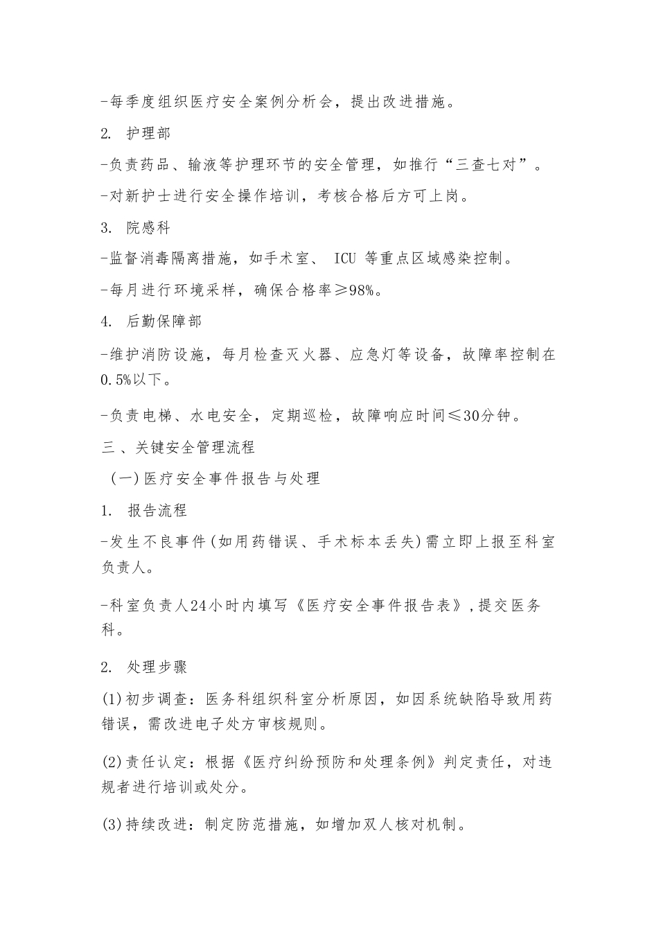 -每季度组织医疗安全案例分析会,提出改进措施。2.护理部-负责药品、输液等护理环节的安全管理,如推行“三查七对”。-对新护士进行安全操作培训,考核合格后方可上岗。3.院感科-监督消毒隔离措施,如手术室、ICU等重点区域感染控制。-每月进行环境采样,确保合格率≥98%。4.后勤保障部-维护消防设施,每月检查灭火器、应急灯等设备,故障率控制在0.5%以下。-负责电梯、水电安全,定期巡检,故障响应时间≤30分钟。三、关键安全管理流程(一)医疗安全事件报告与处理1.报告流程-发生不良事件(如用药错误、手术标本丢失)需立即上报至科室负责人。-科室负责人24小时内填写《医疗安全事件报告表》,提交医务科。2.处理步骤(1)初步调查:医务科组织科室分析原因,如因系统缺陷导致用药错误,需改进电子处方审核规则。(2)责任认定:根据《医疗纠纷预防和处理条例》判定责任,对违规者进行培训或处分。(3)持续改进:制定防范措施,如增加双人核对机制。