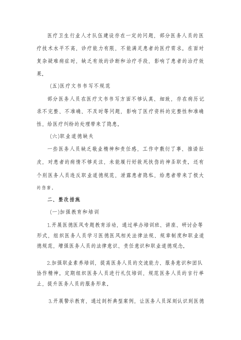 医疗卫生行业人才队伍建设存在一定的问题,部分医务人员的医疗技术水平不高,诊疗能力有限,不能满足患者的医疗需求。在面对复杂疑难病症时,缺乏有效的诊断和治疗手段,影响了患者的治疗效果。(五)医疗文书书写不规范部分医务人员在医疗文书书写方面不够认真、细致,存在病历记录不完整、不准确、不及时等问题,影响了医疗资料的完整性和准确性,给医疗纠纷的处理带来了隐患。(六)职业道德缺失一些医务人员缺乏敬业精神和责任感,工作中敷衍了事、推诿扯皮,对患者的病情不够关注,未能履行好救死扶伤的神圣职责。还有个别医务人员违反职业道德规范,泄露患者隐私,给患者带来了极大的伤害,二、整改措施(一)加强教育和培训1.开展医德医风专题教育活动,通过举办培训班、讲座、研讨会等形式,组织医务人员学习医德医风相关法律法规、规章制度和职业道德规范,增强医务人员的法律意识、责任意识和职业道德观念。2.加强职业素养培训,提高医务人员的交流能力、服务意识和团队协作精神。定期组织医务人员进行礼仪培训,规范医务人员的言行举止,提升医务人员的服务形象。3.开展警示教育,通过剖析典型案例,让医务人员深刻认识到医德