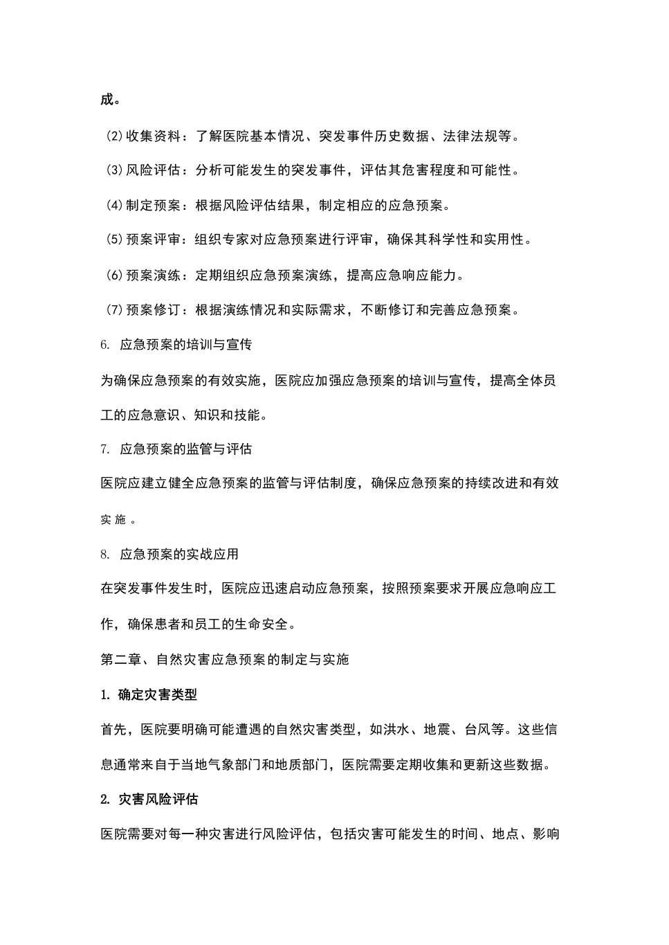 成。(2)收集资料:了解医院基本情况、突发事件历史数据、法律法规等。(3)风险评估:分析可能发生的突发事件,评估其危害程度和可能性。(4)制定预案:根据风险评估结果,制定相应的应急预案。(5)预案评审:组织专家对应急预案进行评审,确保其科学性和实用性。(6)预案演练:定期组织应急预案演练,提高应急响应能力。(7)预案修订:根据演练情况和实际需求,不断修订和完善应急预案。6.应急预案的培训与宣传为确保应急预案的有效实施,医院应加强应急预案的培训与宣传,提高全体员工的应急意识、知识和技能。7.应急预案的监管与评估医院应建立健全应急预案的监管与评估制度,确保应急预案的持续改进和有效实施。8.应急预案的实战应用在突发事件发生时,医院应迅速启动应急预案,按照预案要求开展应急响应工作,确保患者和员工的生命安全。第二章、自然灾害应急预案的制定与实施1.确定灾害类型首先,医院要明确可能遭遇的自然灾害类型,如洪水、地震、台风等。这些信息通常来自于当地气象部门和地质部门,医院需要定期收集和更新这些数据。2.灾害风险评估医院需要对每一种灾害进行风险评估,包括灾害可能发生的时间、地点、影响