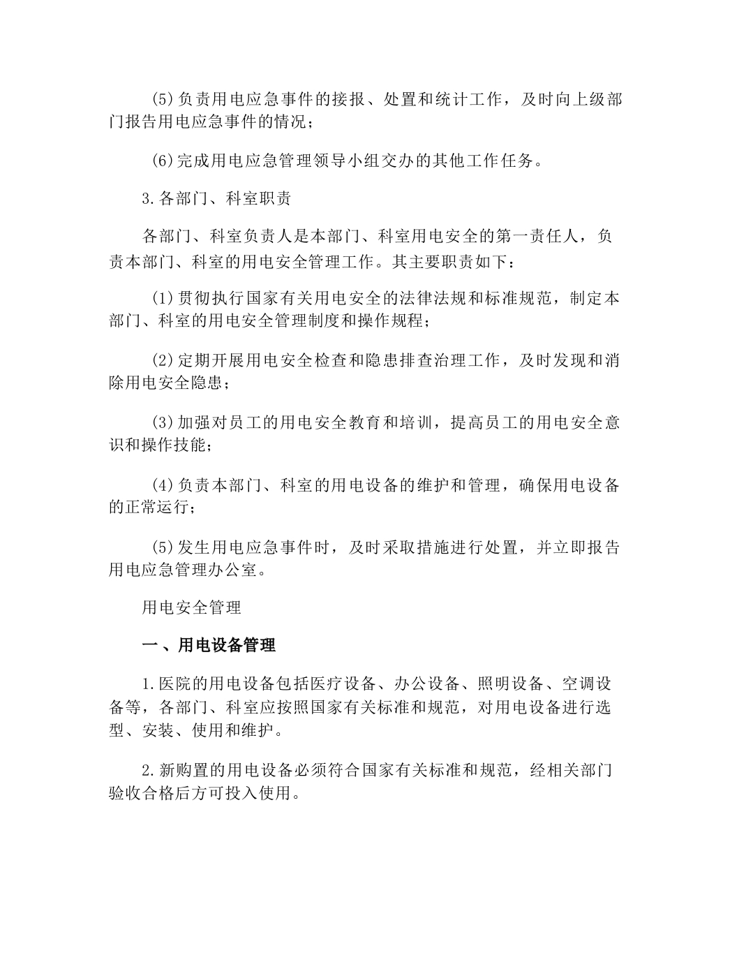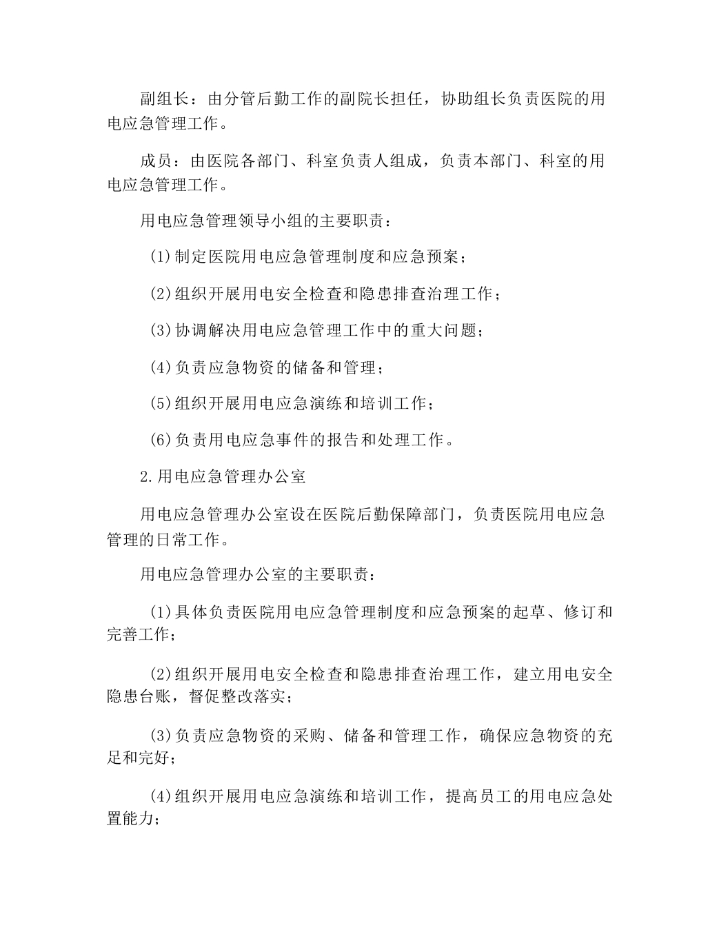 副组长:由分管后勤工作的副院长担任,协助组长负责医院的用电应急管理工作。成员:由医院各部门、科室负责人组成,负责本部门、科室的用电应急管理工作。用电应急管理领导小组的主要职责:(1)制定医院用电应急管理制度和应急预案;(2)组织开展用电安全检查和隐患排查治理工作;(3)协调解决用电应急管理工作中的重大问题:(4)负责应急物资的储备和管理:(5)组织开展用电应急演练和培训工作;(6)负责用电应急事件的报告和处理工作。2.用电应急管理办公室用电应急管理办公室设在医院后勤保障部门,负责医院用电应急管理的日常工作。用电应急管理办公室的主要职责:(1)具体负责医院用电应急管理制度和应急预案的起草、修订和完善工作:(2)组织开展用电安全检查和隐患排查治理工作,建立用电安全隐患台账,督促整改落实;(3)负责应急物资的采购、储备和管理工作,确保应急物资的充足和完好:(4)组织开展用电应急演练和培训工作,提高员工的用电应急处置能力: