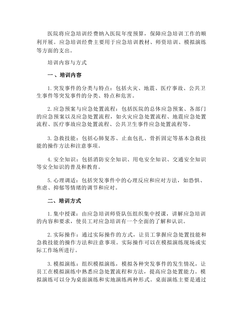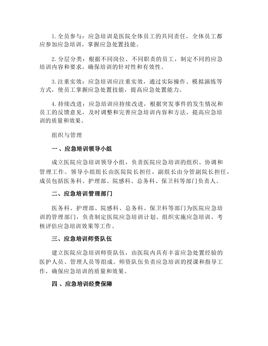 1.全员参与:应急培训是医院全体员工的共同责任,全体员工都应参加应急培训,掌握应急处置技能。2.分层分类:根据不同岗位、不同职责的员工,制定不同的应急培训内容和要求,确保培训的针对性和有效性。3.注重实效:应急培训应注重实效,通过实际操作、模拟演练等方式,使员工掌握应急处置技能,提高应急处置能力。4.持续改进:应急培训应持续改进,根据突发事件的发生情况和员工的反馈意见,及时调整和完善应急培训内容和方法,提高应急培训的质量和效果。组织与管理一、应急培训领导小组成立医院应急培训领导小组,负责医院应急培训的组织、协调和管理工作。领导小组组长由医院院长担任,副组长由分管副院长担任,成员包括医务科、护理部、院感科、总务科、保卫科等部门负责人。二、应急培训管理部门医务科、护理部、院感科、总务科、保卫科等部门为医院应急培训的管理部门,负责制定医院应急培训计划、组织实施应急培训、考核评估应急培训效果等工作。三、应急培训师资队伍建立医院应急培训师资队伍,由医院内具有丰富应急处置经验的医护人员、管理人员等组成。师资队伍负责应急培训的授课和指导工作,确保应急培训的质量和效果。四、应急培训经费保障