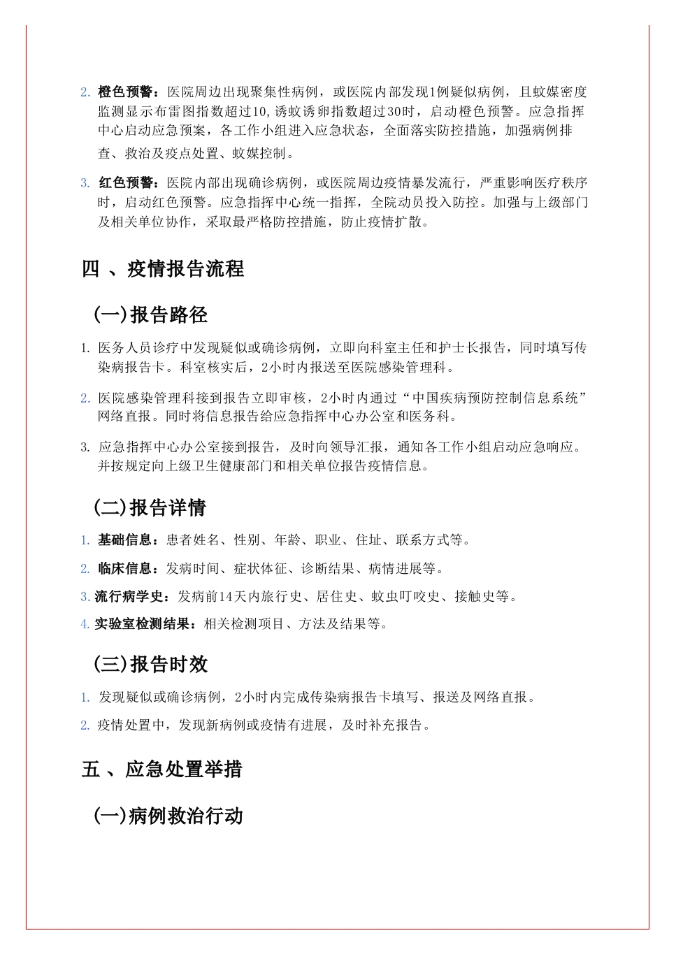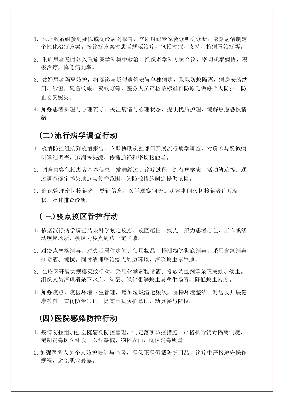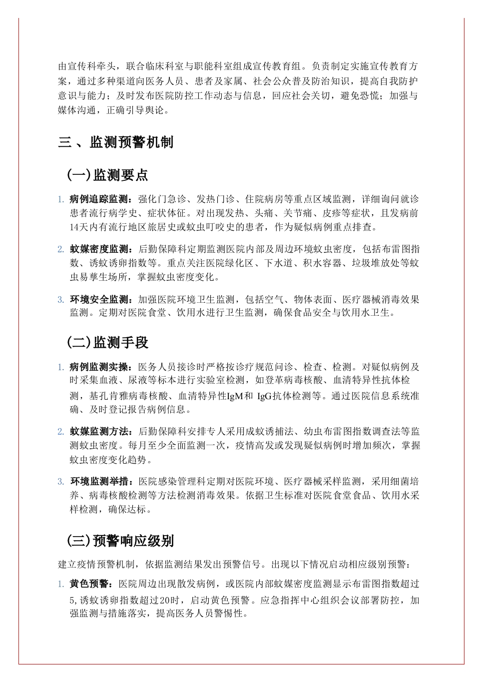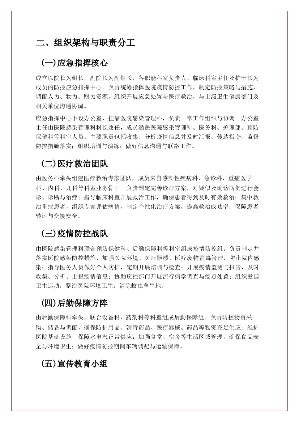 二、组织架构与职责分工(一)应急指挥核心成立以院长为组长,副院长为副组长,各职能科室负责人、临床科室主任及护士长为成员的防控应急指挥中心。负责统筹指挥医院疫情防控工作,制定防控策略与措施,调配人力、物力、财力资源,组织开展应急处置与医疗救治,与上级卫生健康部门及相关单位沟通协调。应急指挥中心下设办公室,挂靠医院感染管理科,负责日常工作组织与协调。办公室主任由医院感染管理科科长兼任,成员涵盖医院感染管理科、医务科、护理部、预防保健科等科室人员。主要职责包括收集、分析疫情信息并及时汇报:传达指令,监督防控措施落实;组织培训与演练;做好信息沟通与联络工作。(二)医疗救治团队由医务科牵头组建医疗救治专家团队,成员来自感染性疾病科、急诊科、重症医学科、内科、儿科等科室业务骨干。负责制定完善诊疗方案,对疑似及确诊病例进行会诊、诊断与治疗;指导临床科室开展救治工作,确保患者得到及时有效救治:集中救治重症患者,组织专家评估病情,制定个性化治疗方案,提高救治成功率;保障患者转运与交接安全。(三)疫情防控战队由医院感染管理科联合预防保健科、后勤保障科等科室组成疫情防控组。负责制定并落实医院感染防控措施,加强医院环境、医疗器械、医疗废物消毒管理,防止院内感染;指导医务人员做好个人防护,定期开展培训与检查;开展疫情监测与报告,及时收集、分析、上报疫情信息;协助疾控部门开展流行病学调查与疫点处置:组织爱国卫生运动,整治医院环境卫生,清除蚊虫孳生地。(四)后勤保障方阵由后勤保障科牵头,联合设备科、药剂科等科室组成后勤保障组。负责防控物资采购、储备与调配,确保防护用品、消毒药品、医疗器械、药品等物资充足供应;维护医院基础设施,保障水电汽正常供应;加强食堂、宿舍等生活区域管理,确保食品安全与环境卫生;做好疫情防控期间车辆调配与运输保障。(五)宜传教育小组