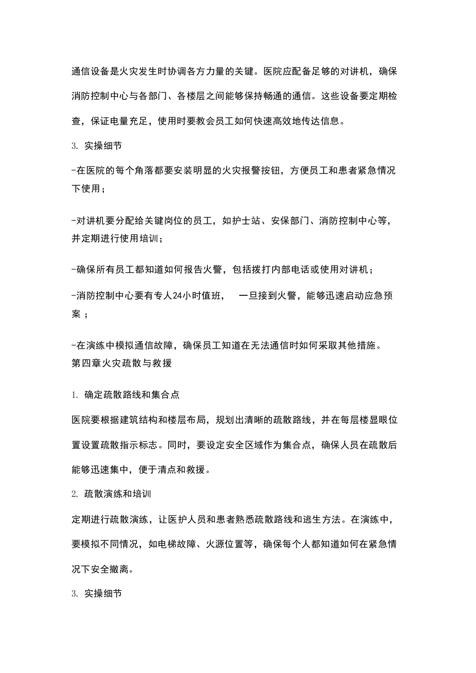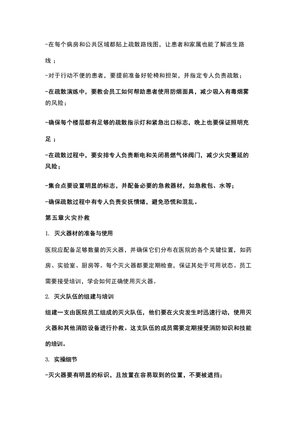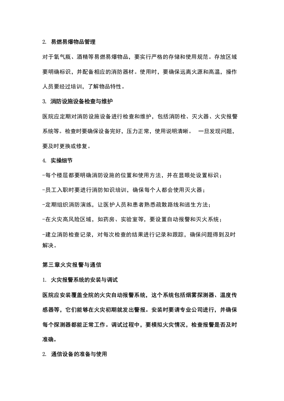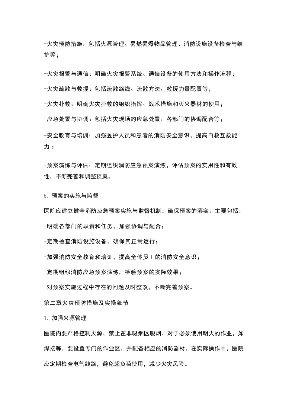 -火灾预防措施:包括火源管理、易燃易爆物品管理、消防设施设备检查与维护等;-火灾报警与通信:明确火灾报警系统、通信设备的使用方法和操作流程;-火灾疏散与救援:包括疏散路线、疏散方法、救援力量配置等;-火灾扑救:明确火灾扑救的组织指挥、战术措施和灭火器材的使用;-应急处置与协调:包括火灾现场的应急处置、各部门的协调配合等;-安全教育与培训:加强医护人员和患者的消防安全意识,提高自救互救能力;-预案演练与评估:定期组织消防应急预案演练,评估预案的实用性和有效性,不断完善和调整预案。5.预案的实施与监督医院应建立健全消防应急预案实施与监督机制,确保预案的落实。主要包括:-明确各部门的职责和任务,加强协调与配合;-定期检查消防设施设备,确保其正常运行;-加强消防安全教育和培训,提高全体员工的消防安全意识;-定期组织消防应急预案演练,检验预案的实际效果;一对预案实施过程中存在的问题及时整改,不断完善预案。第二章火灾预防措施及实操细节1.加强火源管理医院内要严格控制火源,禁止在非吸烟区吸烟,对于必须使用明火的作业,如焊接等,要设置专门的作业区,并配备相应的消防器材。在实际操作中,医院应定期检查电气线路,避免超负荷使用,减少火灾风险。