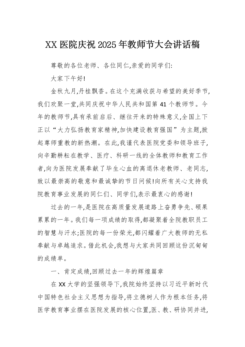 XX医院庆祝2025年教师节大会讲话稿尊敬的各位老师、各位同仁,亲爱的同学们:大家下午好!金秋九月,丹桂飘香。在这个充满收获与希望的美好季节,我们欢聚一堂,共同庆祝中华人民共和国第41个教师节。今年的教师节,具有承前启后、继往开来的特殊意义,全国上下正以“大力弘扬教育家精神,加快建设教育强国”为主题,掀起尊师重教的新热潮。在此,我谨代表医院党委和领导班子,向辛勤耕耘在教学、医疗、科研一线的全体教师和教育工作者,向为医院发展奉献了毕生心血的离退休老教师、老同志,致以最崇高的敬意和最诚挚的节日问候!向所有关心支持我院教育事业发展的同仁们、同学们,表示最衷心的感谢!过去的一年,是医院在高质量发展道路上奋勇争先、硕果累累的一年。我们每一项成绩的取得,都凝聚着全院教职员工的智慧与汗水;医院的每一份荣光,都闪耀着广大教师的无私奉献与卓越追求。借此机会,我想与大家共同回顾这份沉甸甸的成绩单。一、肯定成绩,回顾过去一年的辉煌篇章在X大学的坚强领导下,我院始终坚持以习近平新时代中国特色社会主义思想为指导,将立德树人作为根本任务,将医学教育事业摆在医院发展的核心位置,医、教、研协同并进,