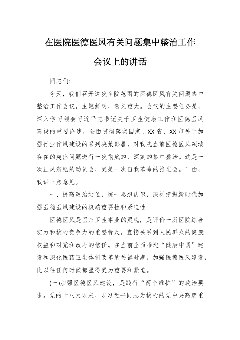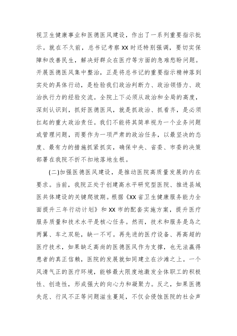视卫生健康事业和医德医风建设,作出了一系列重要指示批示。就在不久前,总书记考察X时还特别强调,要切实保障和改善民生,解决好群众在医疗等方面的急难愁盼问题。开展医德医风集中整治,正是将总书记的重要指示精神落到实处的具体行动,是检验我们政治判断力、政治领悟力、政治执行力的经验交流。全院上下必须从政治和全局的高度,深刻认识到,抓好医德医风,就是抓政治、抓看齐,是必须扛起的重大政治责任。我们不能将其简单视为一个业务问题或管理问题,而要作为一项严肃的政治任务,以最坚决的态度、最有力的措施抓紧抓实,确保中央、省委、市委的决策部署在我院不折不扣地落地生根。(二)加强医德医风建设,是推动医院高质量发展的内在要求。当前,我院正处于创建高水平研究型医院、推进县域医共体建设的关键爬坡期。根据《XX省卫生健康服务能力全面提升三年行动计划》和X市的配套实施方案,提升医疗服务质量和技术水平是核心任务。然而,技术和服务是鸟之两翼、车之双轮,缺一不可。再先进的医疗设备、再高超的医疗技术,如果缺乏高尚的医德医风作为支撑,也无法赢得患者的真正信赖,医院的发展就如同建立在沙滩之上。一个风清气正的医疗环境,能够最大限度地激发全体职工的积极性、创造性,形成强大的向心力和凝聚力。反之,如果医德失范、行风不正等问题滋生蔓延,不仅会侵蚀医院的社会声