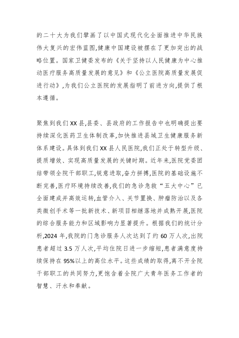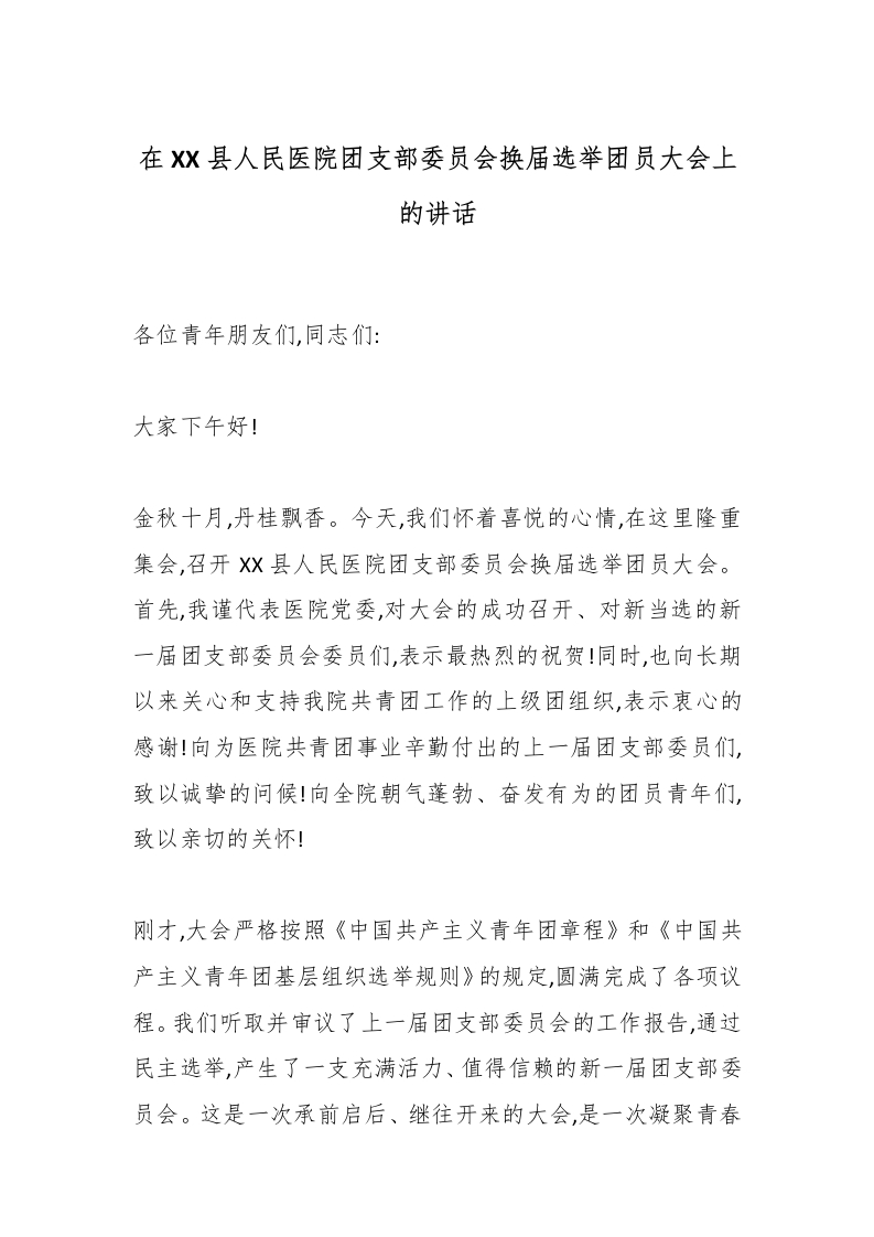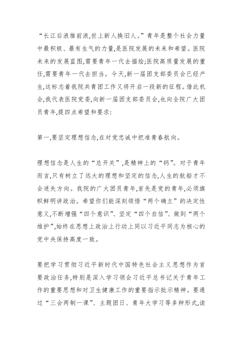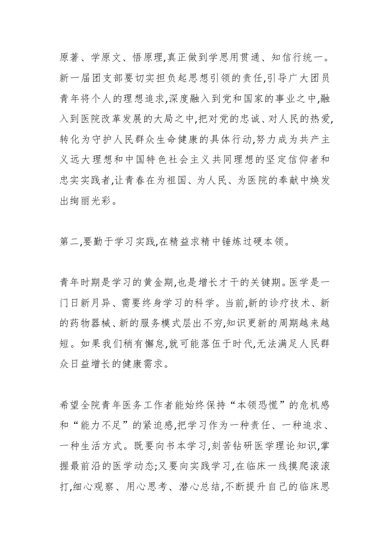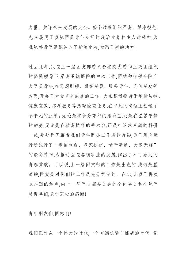 力量、共谋未来发展的大会。整个过程组织严密、程序规范,充分展现了我院团员青年良好的政治素养和主人翁精神,为我院共青团组织注入了新鲜血液,增添了新的活力。过去几年,我院上一届团支部委员会在院党委和上级团组织的坚强领导下,紧密围绕医院的中心工作,团结和带领全院广大团员青年,在思想引领、组织建设、服务青年、岗位建功等方面,开展了大量卓有成效的工作。大家积极投身于疫情防控、健康宣教、志愿服务等急难险重任务,在平凡的岗位上创造了不平凡的业绩。无论是在争分夺秒的急诊室,还是在温馨宁静的病房;无论是在精密操作的手术台,还是在追求卓越的科研一线,处处都闪耀着我们青年医务工作者的身影,你们用实际行动践行了“敬佑生命、救死扶伤、甘于奉献、大爱无疆”的崇高精神,为推动医院各项事业的发展,作出了不可磨灭的青春贡献。可以说,上一届团支部的工作是出色的,成绩是显著的,院党委对你们的工作是充分肯定的。在此,让我们再次以热烈的掌声,向上一届团支部委员会的全体委员和全院团员青年们,表示衷心的感谢!青年朋友们,同志们!我们正处在一个伟大的时代,一个充满机遇与挑战的时代。党