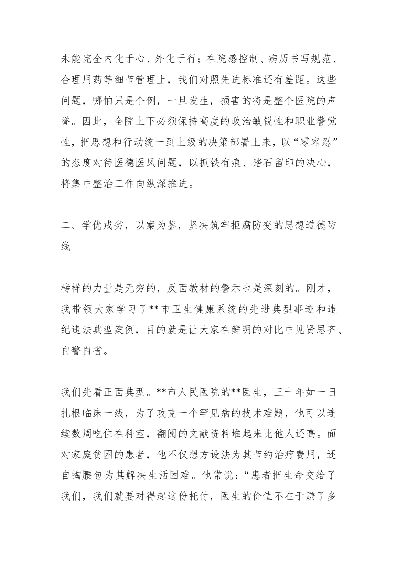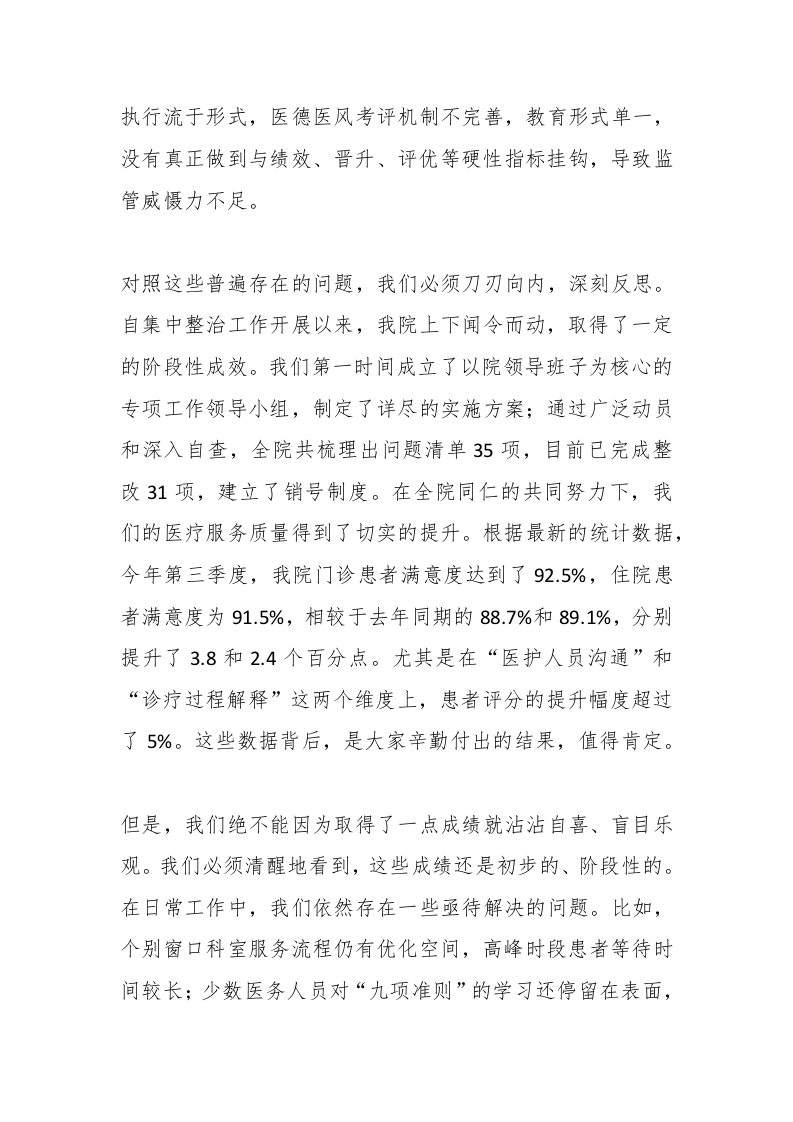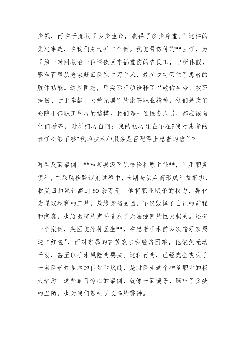要求我们怀有高尚的德行。近期,全国上下正以前所未有的力度推进医药领域腐败问题和不正之风的集中整治工作,这既是一场深刻的行业净化,也是对我们每一位医务工作者党性、品行和操守的重大考验。我们必须清醒地认识到,加强医德医风建设,不是一项可有可无的“软任务”,而是必须抓紧抓好的“硬骨头”,是关乎医院生存发展的生命线工程。从上级通报的情况来看,一些医疗机构的问题依然不容忽视。在全市范围内,通过系统性排查近6万名医疗机构从业人员,就发现了各类问题高达5847条。这些问题形形色色,暴露出我们在管理和执行层面存在的短板。综合多份督查报告分析,问题主要集中在几个方面:一是部分医务人员服务意识淡薄,对患者缺乏耐心,沟通技巧欠缺,导致“生、冷、硬、顶、推”的现象偶有发生,严重影响了患者的就医体验。二是少数人员纪律观念松弛,存在违规收受“红包”、礼品、回扣等现象,甚至利用职务之便在药品、耗材、检查设备采购中谋取不正当利益,这是我们绝对不能容忍的底线问题。三是过度诊疗、过度检查、滥用抗菌药物等医疗乱象依然存在,不仅加重了患者的经济负担,也损害了医保基金的安全和医疗行业的公信力。据一份专项督查报告显示,仅通过病历鉴定就发现各类不规范问题122个,其中临床抗菌药物使用存在缺陷的问题尤为突出。四是部分科室管理缺位,制度