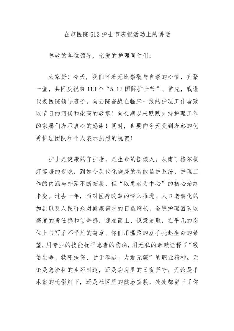 在市医院512护士节庆祝活动上的讲话尊敬的各位领导、亲爱的护理同仁们:大家好!今天,我们怀着无比崇敬与自豪的心情,齐聚一堂,共同庆祝第113个“5.12国际护士节”。首先,我谨代表医院领导班子,向全院奋战在临床一线的护理工作者致以节日的问候和崇高的敬意!向长期以来默默支持护理工作的家属们表示衷心的感谢!同时,也要向今天受到表彰的优秀护理团队和个人表示热烈的祝贺!护士是健康的守护者,是生命的摆渡人。从南丁格尔提灯巡房的夜晚,到如今现代化病房的智能监护系统,护理工作的内涵与外延不断拓展,但“以患者为中心”的初心始终未变。过去一年,面对医疗改革的深入推进、人口老龄化的加剧以及人民群众对健康需求的日益增长,全院护理团队以高度的责任感和使命感,迎难而上、锐意进取,在平凡的岗位上书写了不平凡的篇章。你们用温柔的双手托起生命的希望,用专业的技能抚平患者的伤痛,用无私的奉献诠释了“敬佑生命、救死扶伤、甘于奉献、大爱无疆”的职业精神。无论是急诊科的生死时速,还是病房里的日夜坚守;无论是手术室的无影灯下,还是社区里的健康宣教,处处都留下了你