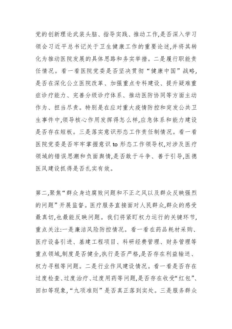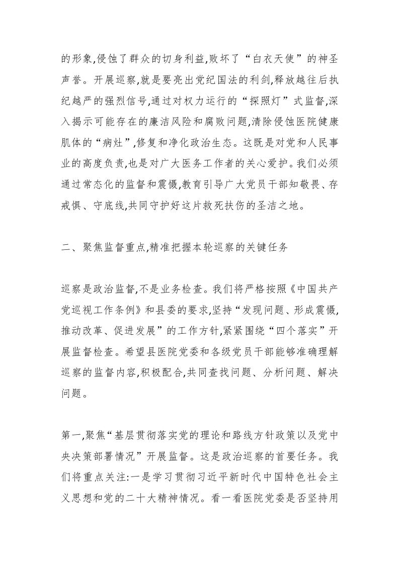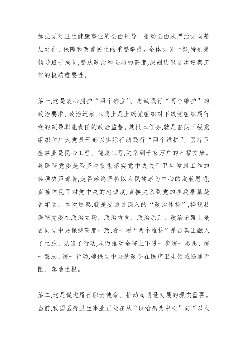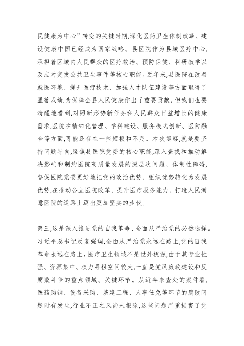 加强党对卫生健康事业的全面领导、推动全面从严治党向基层延伸、保障和改善民生的重要举措。全体党员干部,特别是领导班子成员,要从政治和全局的高度,深刻认识这次巡察工作的极端重要性。第一,这是衷心拥护“两个确立”、忠诚践行“两个维护”的政治要求。政治巡察,本质上是上级党组织对下级党组织履行党的领导职能责任的政治监督。其根本任务,就是督促下级党组织和广大党员干部以实际行动践行“两个维护”。医疗卫生事业是民心工程、德政工程,关系到千家万户的幸福安康。县医院党委是否坚决贯彻落实党中央关于卫生健康工作的各项决策部署,是否始终坚持以人民健康为中心的发展思想,直接体现了对党中央的忠诚度,直接关系到党的执政根基是否牢固。本次巡察,就是要通过深入的“政治体检”,检视县医院党委在政治立场、政治方向、政治原则、政治道路上是否同党中央保持高度一致,看一看“两个维护”是否真正融入了血脉、见诸了行动,从而推动全院上下进一步统一思想、统一意志、统一行动,确保党中央的政令在医疗卫生领域畅通无阻、落地生根。第二,这是促进履行职责使命、推动高质量发展的现实需要。当前,我国医疗卫生事业正处在从“以治病为中心”向“以人
