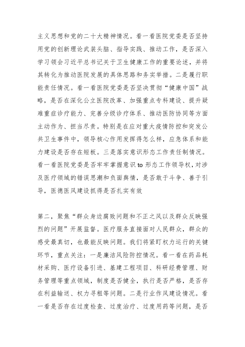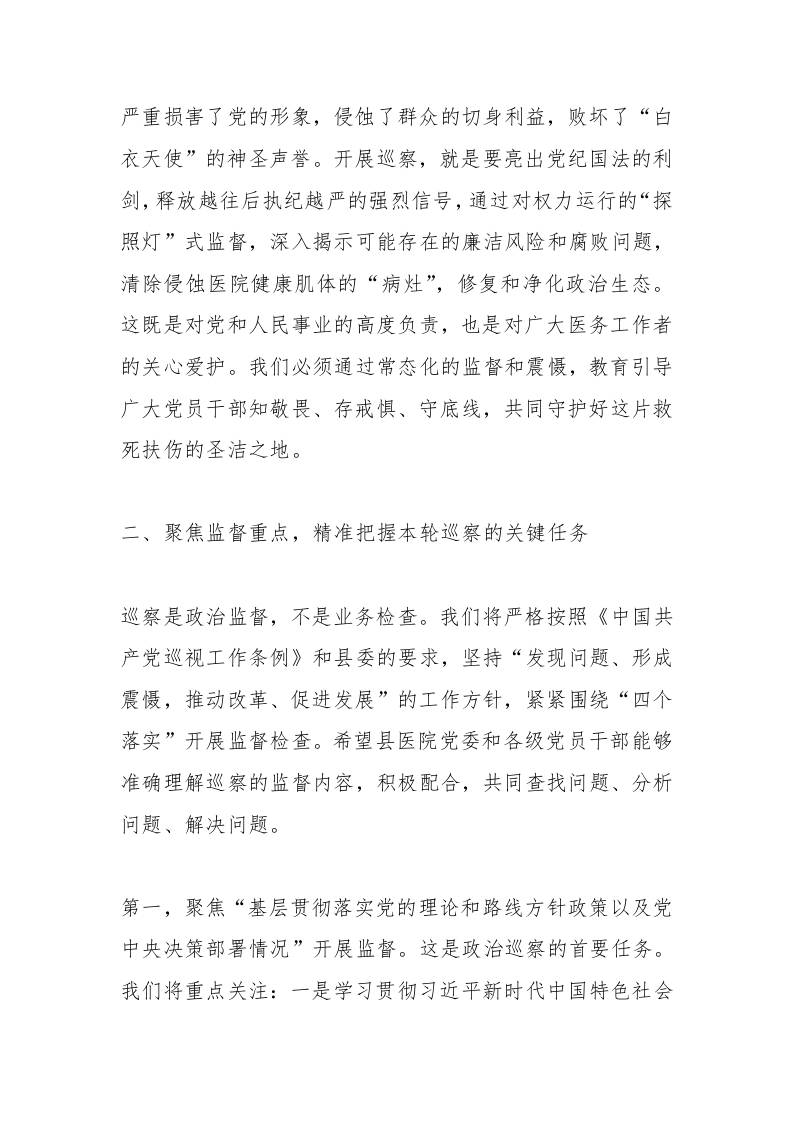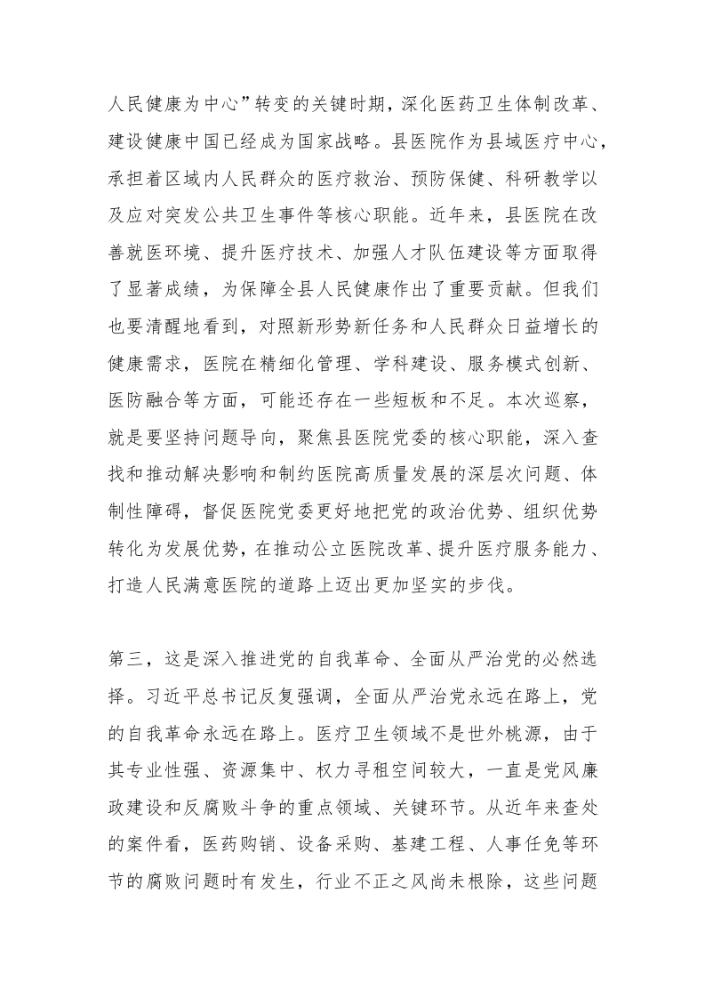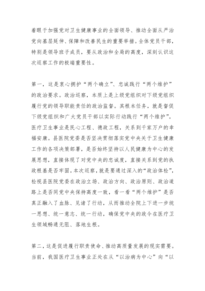 着眼于加强党对卫生健康事业的全面领导、推动全面从严治党向基层延伸、保障和改善民生的重要举措。全体党员干部,特别是领导班子成员,要从政治和全局的高度,深刻认识这次巡察工作的极端重要性。第一,这是衷心拥护“两个确立”、忠诚践行“两个维护”的政治要求。政治巡察,本质上是上级党组织对下级党组织履行党的领导职能责任的政治监督。其根本任务,就是督促下级党组织和广大党员干部以实际行动践行“两个维护”。医疗卫生事业是民心工程、德政工程,关系到千家万户的幸福安康。县医院党委是否坚决贯彻落实党中央关于卫生健康工作的各项决策部署,是否始终坚持以人民健康为中心的发展思想,直接体现了对党中央的忠诚度,直接关系到党的执政根基是否牢固。本次巡察,就是要通过深入的“政治体检”,检视县医院党委在政治立场、政治方向、政治原则、政治道路上是否同党中央保持高度一致,看一看“两个维护”是否真正融入了血脉、见诸了行动,从而推动全院上下进一步统一思想、统一意志、统一行动,确保党中央的政令在医疗卫生领域畅通无阻、落地生根。第二,这是促进履行职责使命、推动高质量发展的现实需要。当前,我国医疗卫生事业正处在从“以治病为中心”向“以