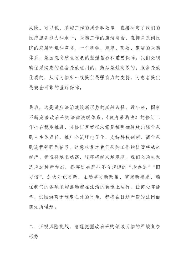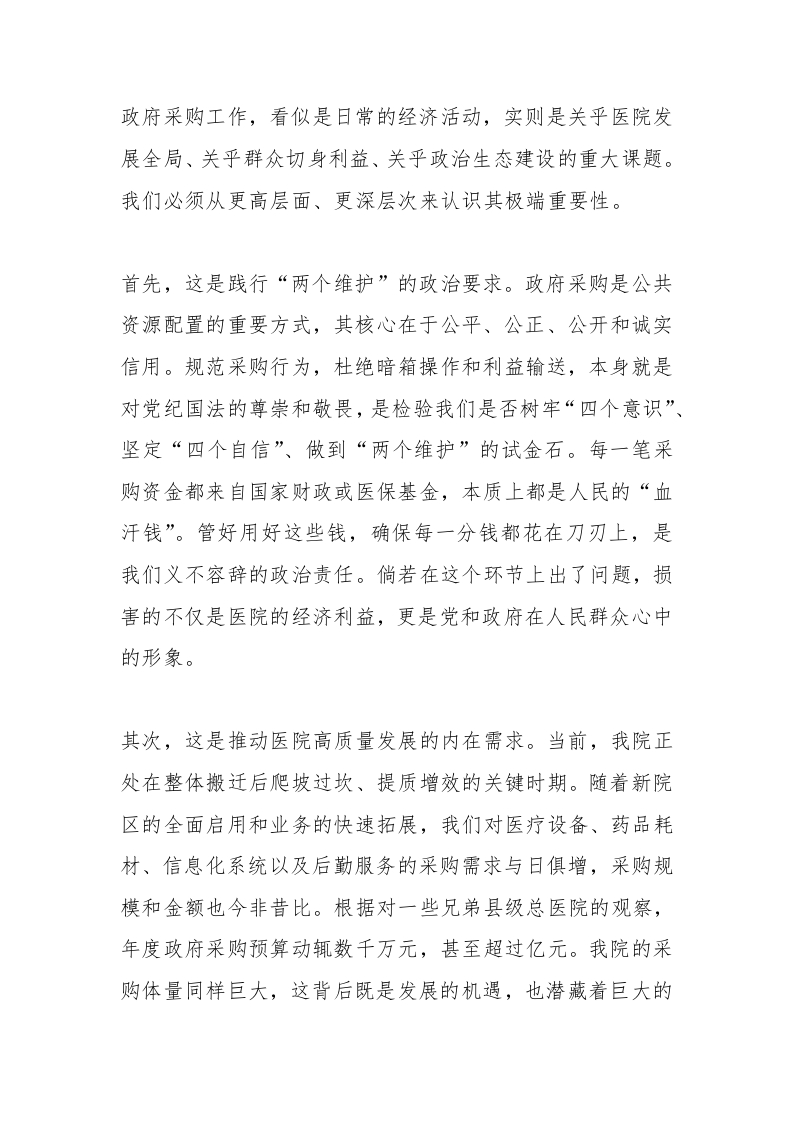 政府采购工作,看似是日常的经济活动,实则是关乎医院发展全局、关乎群众切身利益、关乎政治生态建设的重大课题。我们必须从更高层面、更深层次来认识其极端重要性。首先,这是践行“两个维护”的政治要求。政府采购是公共资源配置的重要方式,其核心在于公平、公正、公开和诚实信用。规范采购行为,杜绝暗箱操作和利益输送,本身就是对党纪国法的尊崇和敬畏,是检验我们是否树牢“四个意识”、坚定“四个自信”、做到“两个维护”的试金石。每一笔采购资金都来自国家财政或医保基金,本质上都是人民的“血汗钱”。管好用好这些钱,确保每一分钱都花在刀刃上,是我们义不容辞的政治责任。倘若在这个环节上出了问题,损害的不仅是医院的经济利益,更是党和政府在人民群众心中的形象。其次,这是推动医院高质量发展的内在需求。当前,我院正处在整体搬迁后爬坡过坎、提质增效的关键时期。随着新院区的全面启用和业务的快速拓展,我们对医疗设备、药品耗材、信息化系统以及后勤服务的采购需求与日俱增,采购规模和金额也今非昔比。根据对一些兄弟县级总医院的观察,年度政府采购预算动辄数千万元,甚至超过亿元。我院的采购体量同样巨大,这背后既是发展的机遇,也潜藏着巨大的