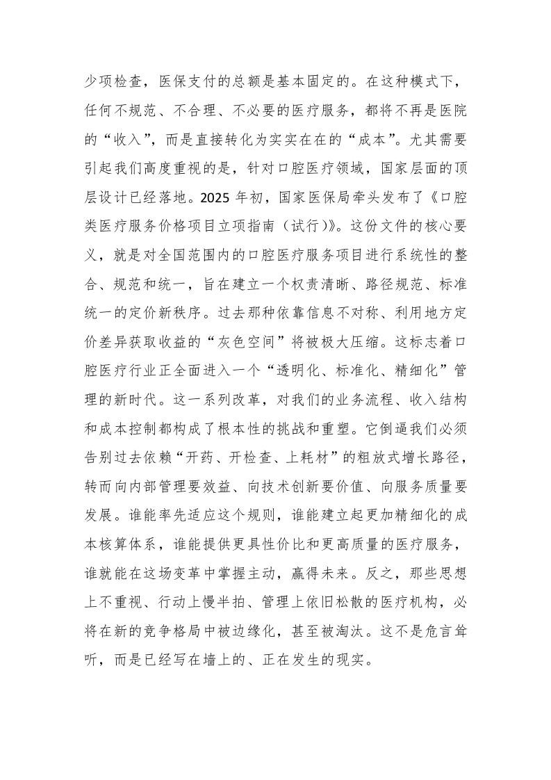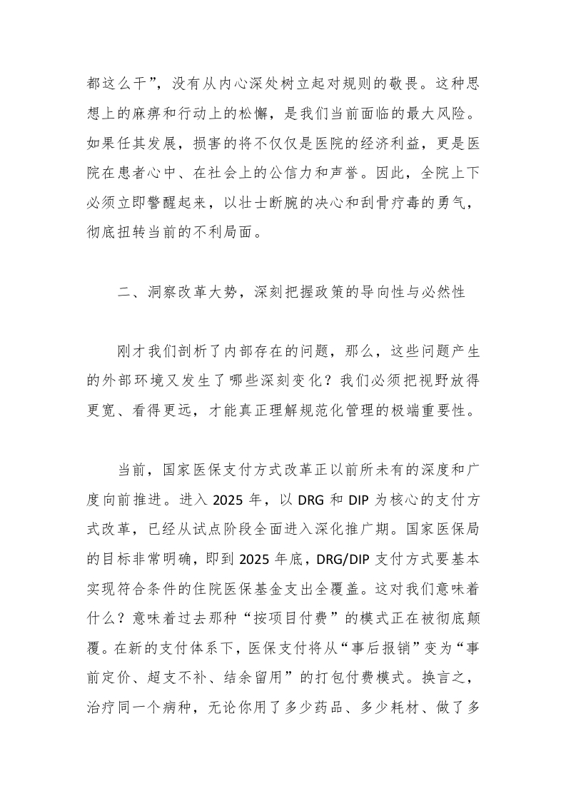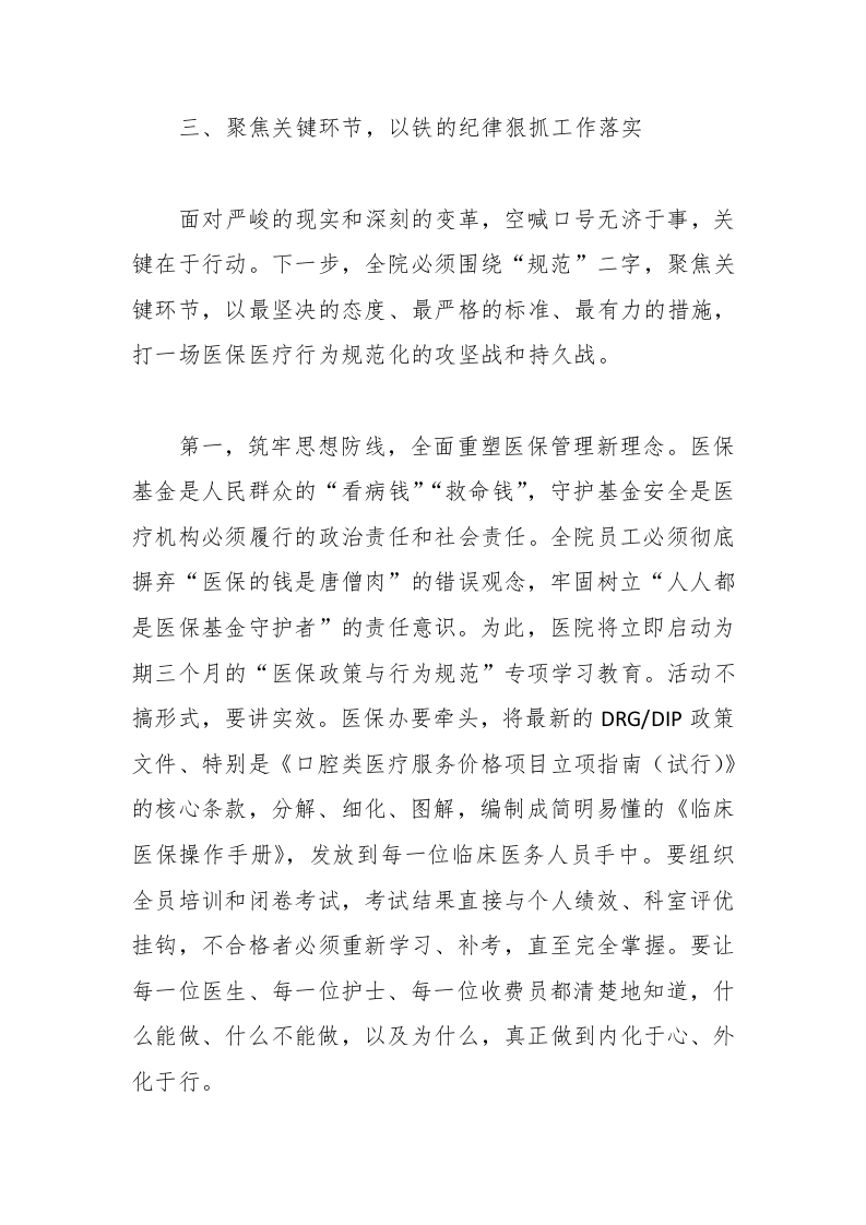 我院因费用上传不规范、诊疗项目与医保编码对应错误等问题,导致的医保结算驳回率达到了7.3%,不仅高于全市同级医院平均水平2.5个百分点,更直接造成了数百万元的经济损失。这仅仅是冰山一角。更令人忧心的是,这些问题背后所暴露出的深层次弊病。部分临床科室和医务人员,对医保政策的学习理解仍然停留在表面,满足于“大概知道”,对于具体条款、操作细则缺乏深入研究,导致在实际工作中出现“习惯性违规”。比如,有的医生在诊疗过程中,依然延续着过去粗放式的收费习惯,将可以打包收费的项目拆解开来,或者将自费项目与医保项目混淆,增加了患者负担,也给医保基金带来了风险。在病历书写方面,抽查的150份归档病历中,甲级病历率仅为85%,远低于我们95%的目标。其中,存在诸如诊断依据不充分、治疗方案缺乏动态调整记录、知情同意书签署不规范等问题的病历占比高达12%。这些看似细微的瑕疵,不仅是医疗质量的硬伤,更是潜在医疗纠纷的导火索。我们必须清醒地认识到,这些问题绝非个别人员的偶然失误,而是反映出我们在制度执行、流程管理、责任意识上存在着系统性的短板。有的科室负责人,对科内医保和医疗质量管理抱有“鸵鸟心态”,认为“不出事就行”,缺乏常态化的自查自纠机制。有的员工,甚至还抱有“法不责众”的侥幸心理,认为“大家