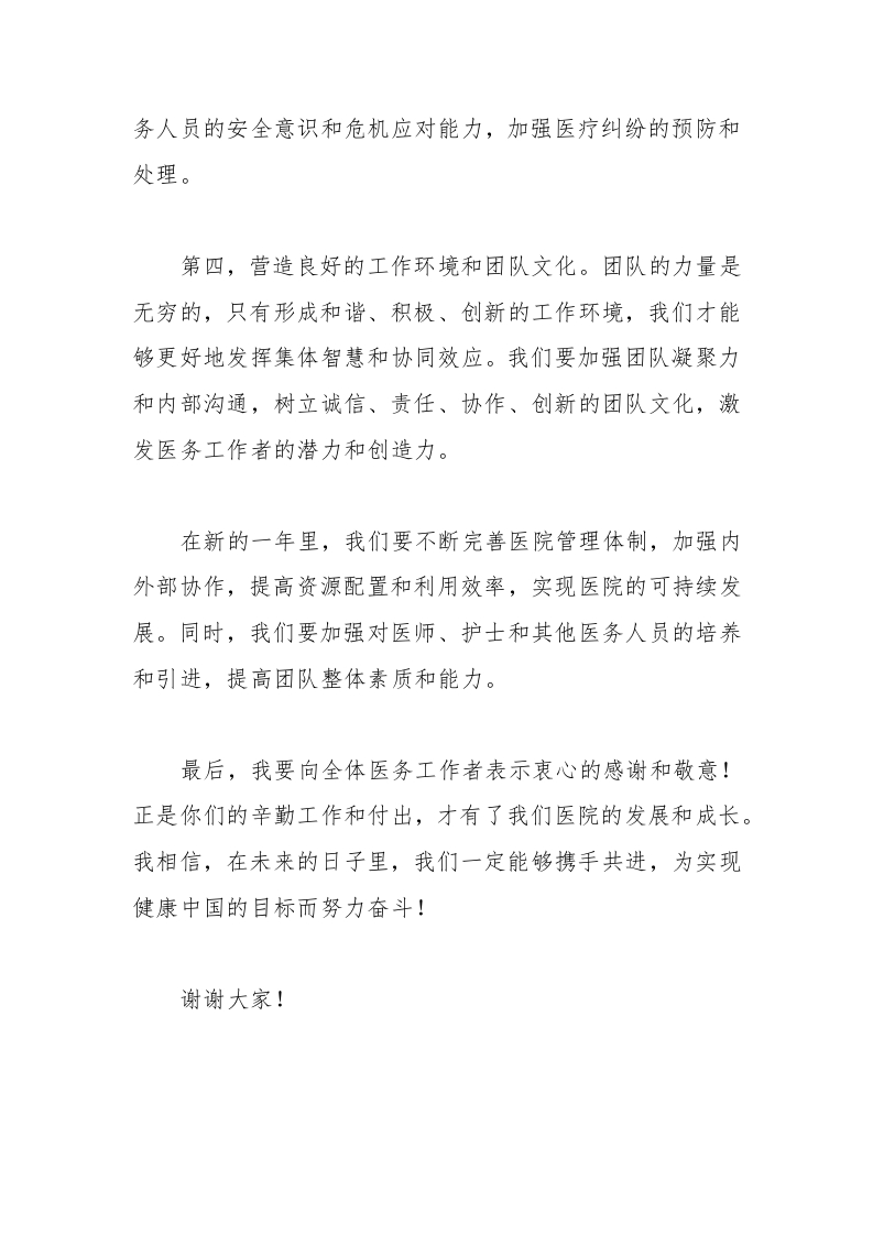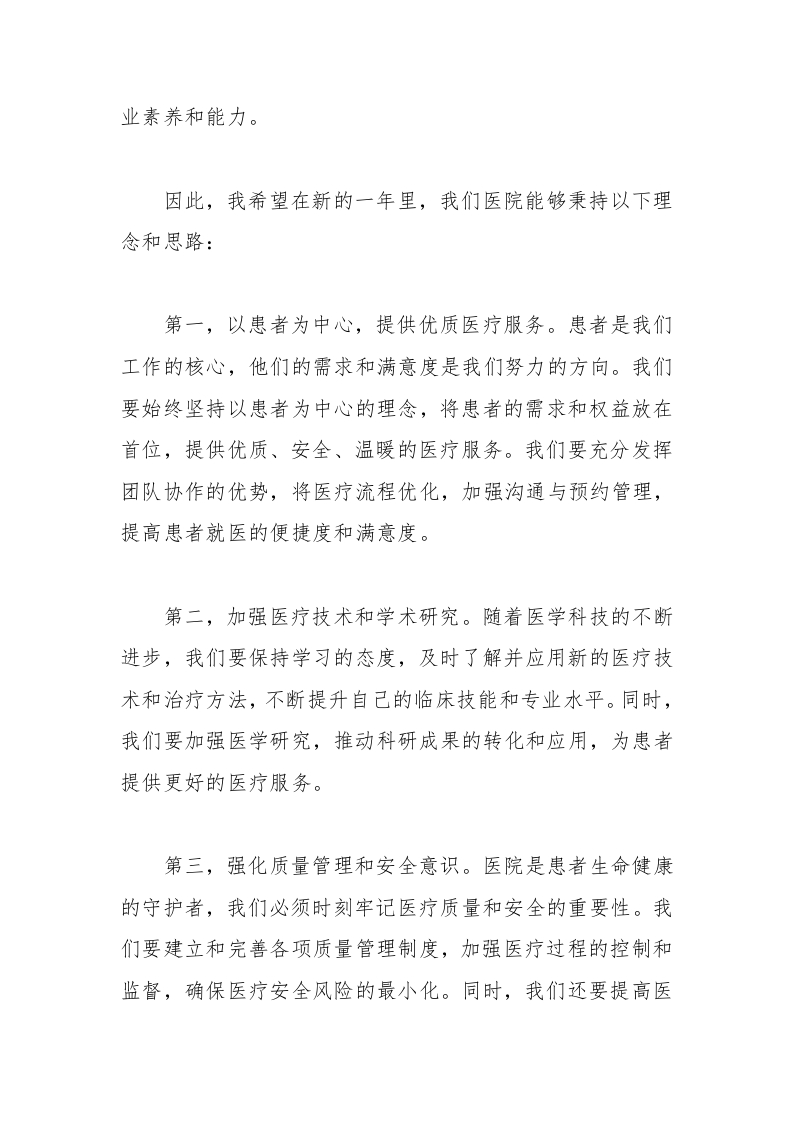 业素养和能力。因此,我希望在新的一年里,我们医院能够秉持以下理念和思路:第一,以患者为中心,提供优质医疗服务。患者是我们工作的核心,他们的需求和满意度是我们努力的方向。我们要始终坚持以患者为中心的理念,将患者的需求和权益放在首位,提供优质、安全、温暖的医疗服务。我们要充分发挥团队协作的优势,将医疗流程优化,加强沟通与预约管理,提高患者就医的便捷度和满意度。第二,加强医疗技术和学术研究。随着医学科技的不断进步,我们要保持学习的态度,及时了解并应用新的医疗技术和治疗方法,不断提升自己的临床技能和专业水平。同时,我们要加强医学研究,推动科研成果的转化和应用,为患者提供更好的医疗服务。第三,强化质量管理和安全意识。医院是患者生命健康的守护者,我们必须时刻牢记医疗质量和安全的重要性。我们要建立和完善各项质量管理制度,加强医疗过程的控制和监督,确保医疗安全风险的最小化。同时,我们还要提高医