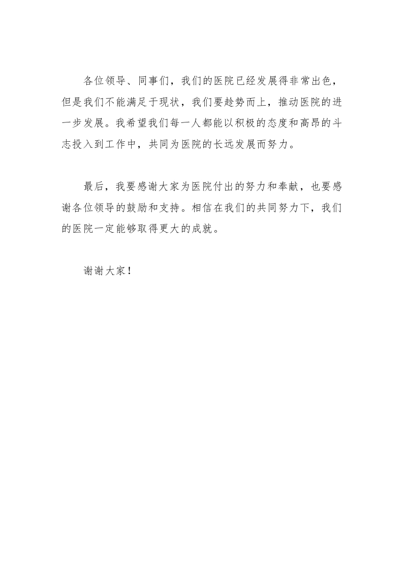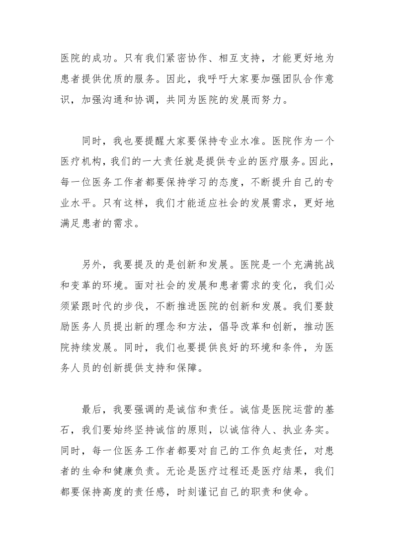 医院的成功。只有我们紧密协作、相互支持,才能更好地为患者提供优质的服务。因此,我呼吁大家要加强团队合作意识,加强沟通和协调,共同为医院的发展而努力。同时,我也要提醒大家要保持专业水准。医院作为一个医疗机构,我们的一大责任就是提供专业的医疗服务。因此,每一位医务工作者都要保持学习的态度,不断提升自己的专业水平。只有这样,我们才能适应社会的发展需求,更好地满足患者的需求。另外,我要提及的是创新和发展。医院是一个充满挑战和变革的环境。面对社会的发展和患者需求的变化,我们必须紧跟时代的步伐,不断推进医院的创新和发展。我们要鼓励医务人员提出新的理念和方法,倡导改革和创新,推动医院持续发展。同时,我们也要提供良好的环境和条件,为医务人员的创新提供支持和保障。最后,我要强调的是诚信和责任。诚信是医院运营的基石,我们要始终坚持诚信的原则,以诚信待人、执业务实。同时,每一位医务工作者都要对自己的工作负起责任,对患者的生命和健康负责。无论是医疗过程还是医疗结果,我们都要保持高度的责任感,时刻谨记自己的职责和使命。