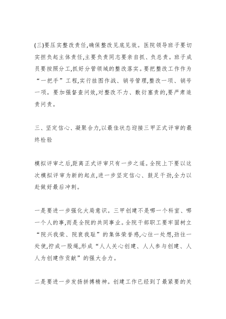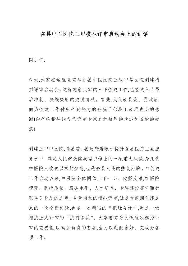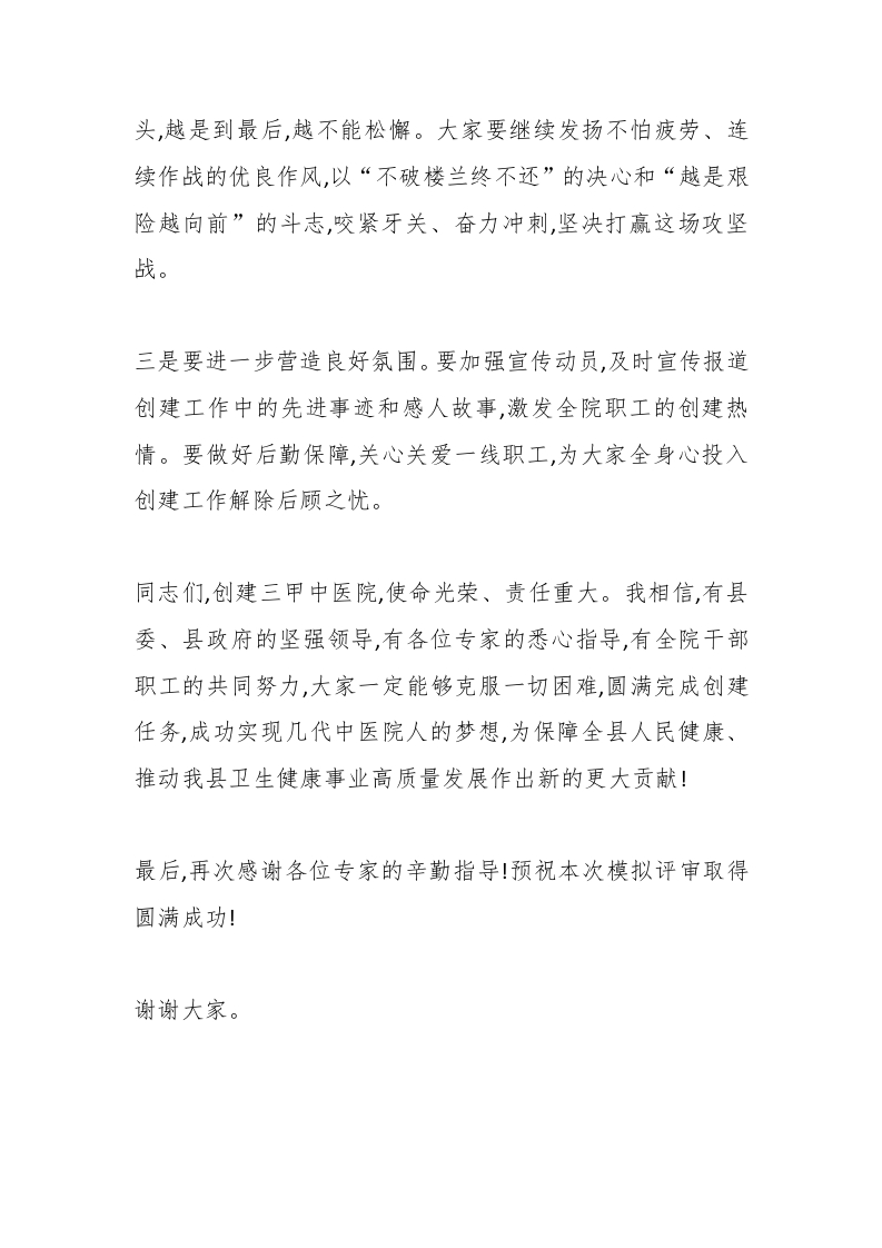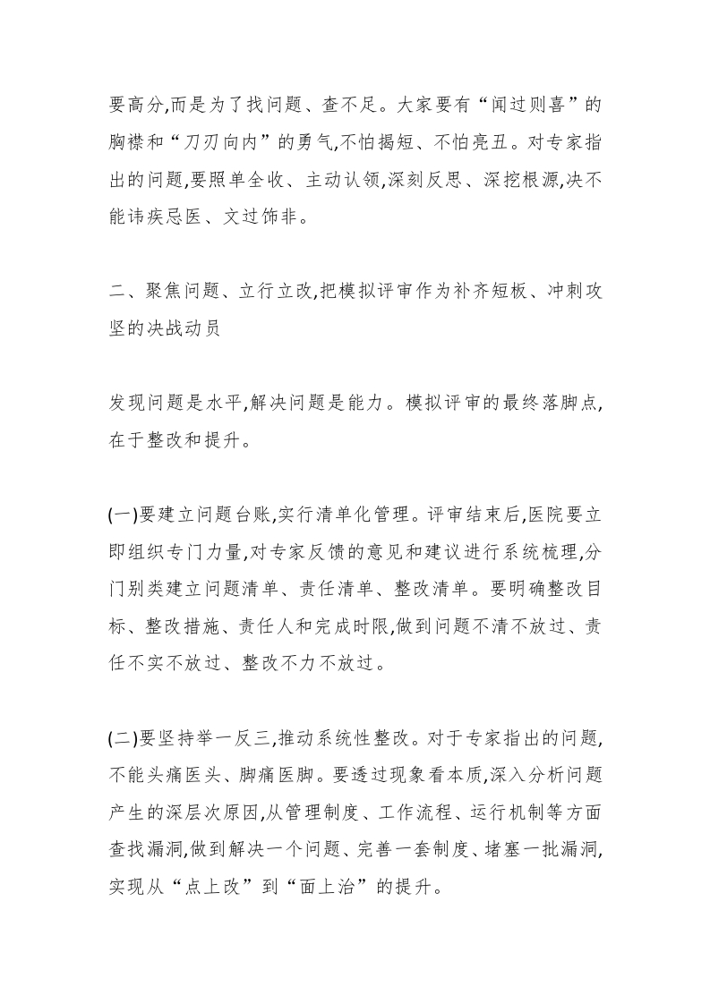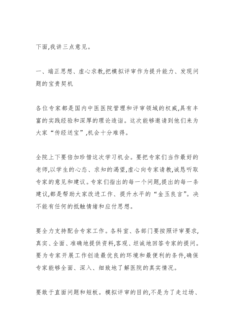 下面,我讲三点意见。一、端正思想、虚心求教,把模拟评审作为提升能力、发现问题的宝贵契机各位专家都是国内中医医院管理和评审领域的权威,具有丰富的实践经验和深厚的理论造诣。这次能够邀请到他们来为大家“传经送宝”,机会十分难得。全院上下要倍加珍惜这次学习机会。要把专家们当作最好的老师,以学生的心态、求知的渴望,虚心向专家请教,诚恳听取专家的意见和建议。专家们指出的每一个问题,提出的每一条建议,都是帮助大家改进工作、提升水平的“金玉良言”。决不能有任何的抵触情绪和应付思想。要全力支持配合专家工作。各科室、各部门要按照评审要求,真实、全面、准确地提供资料,客观、坦诚地回答专家的提问。要为专家开展工作创造最优良的环境和最便利的条件,确保专家能够全面、深入、细致地了解医院的真实情况。要敢于直面问题和短板。模拟评审的目的,不是为了走过场、