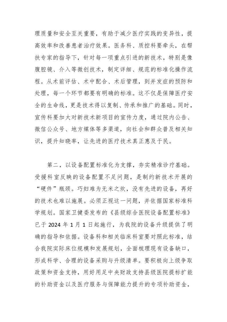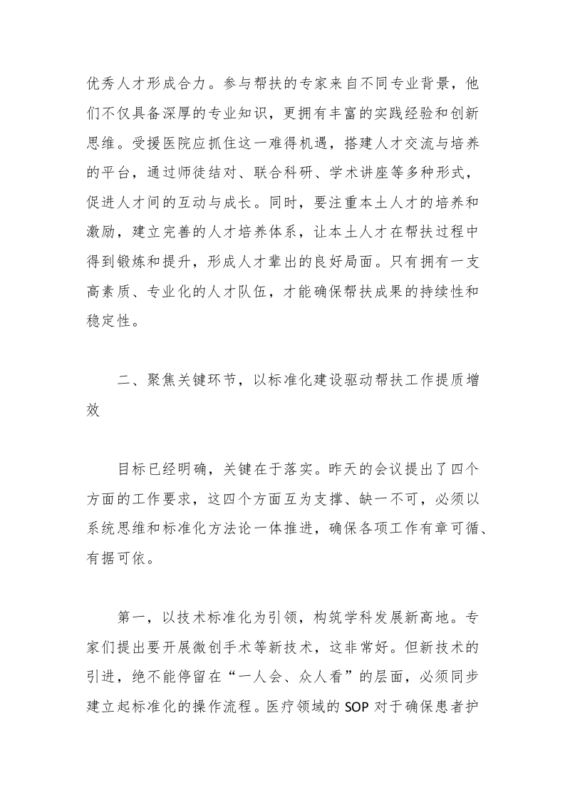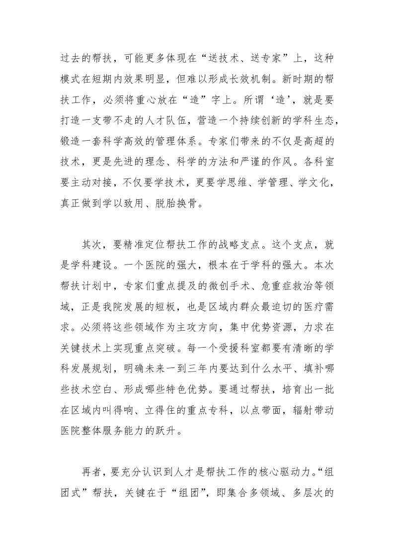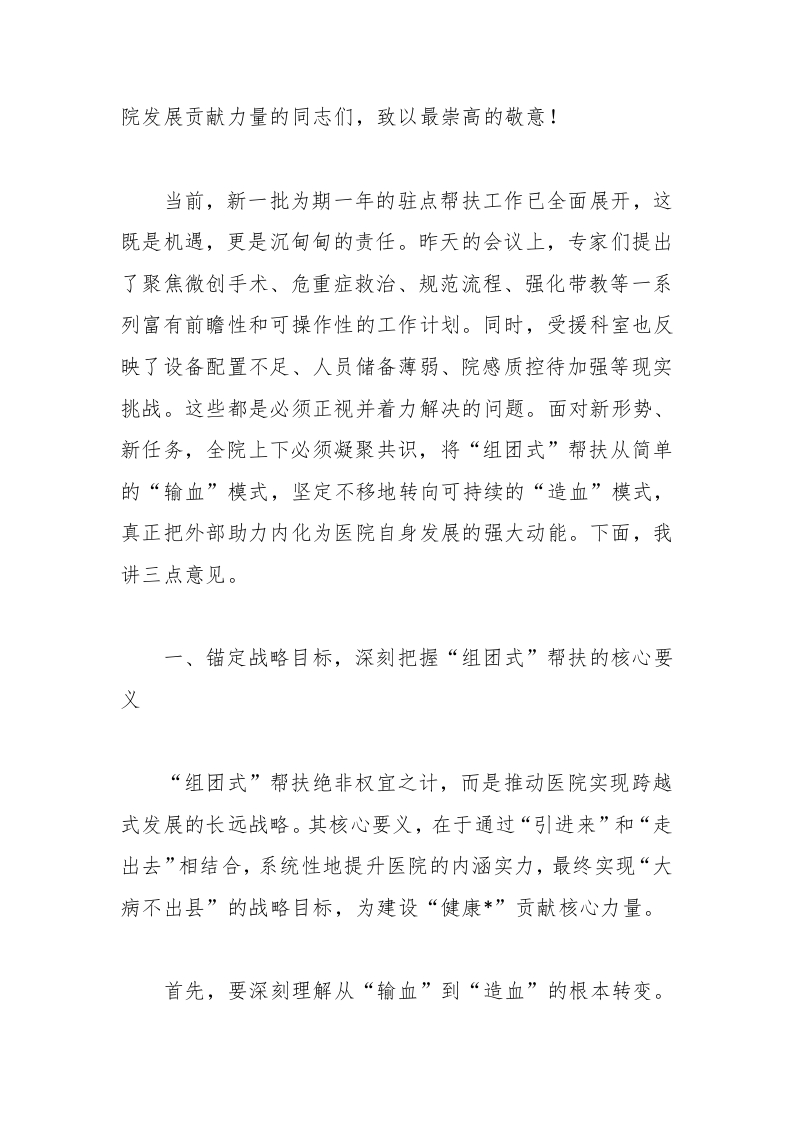 院发展贡献力量的同志们,致以最崇高的敬意!当前,新一批为期一年的驻点帮扶工作已全面展开,这既是机遇,更是沉甸甸的责任。昨天的会议上,专家们提出了聚焦微创手术、危重症救治、规范流程、强化带教等一系列富有前瞻性和可操作性的工作计划。同时,受援科室也反映了设备配置不足、人员储备薄弱、院感质控待加强等现实挑战。这些都是必须正视并着力解决的问题。面对新形势、新任务,全院上下必须凝聚共识,将“组团式”帮扶从简单的“输血”模式,坚定不移地转向可持续的“造血”模式,真正把外部助力内化为医院自身发展的强大动能。下面,我讲三点意见。一、锚定战略目标,深刻把握“组团式”帮扶的核心要义“组团式”帮扶绝非权宜之计,而是推动医院实现跨越式发展的长远战略。其核心要义,在于通过“引进来”和“走出去”相结合,系统性地提升医院的内涵实力,最终实现“大病不出县”的战略目标,为建设“健康*”贡献核心力量。首先,要深刻理解从“输血”到“造血”的根本转变。