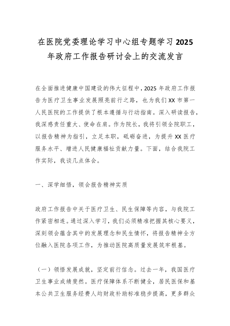 在医院党委理论学习中心组专题学习2025年政府工作报告研讨会上的交流发言在全面推进健康中国建设的伟大征程中,2025年政府工作报告为医疗卫生事业发展照亮前行之路,也为我们X市第一人民医院的工作提供了根本遵循与行动指南。深入研读报告,我深感责任重大、使命在肩。作为院长,我将引领全院职工,以报告精神为指引,立足本职,砥砺奋进,为提升X医疗服务水平、增进人民健康福祉贡献力量。下面,结合我院工作实际,我谈几点体会。一、深学细悟,领会报告精神实质政府工作报告中关于医疗卫生、民生保障等内容,与我院工作紧密相连。通过深入学习,我们必须精准把握其核心要义,深刻领会蕴含其中的发展理念和民生情怀,将报告精神全方位融入医院各项工作,为推动医院高质量发展筑牢根基。(一)领悟发展成就,坚定前行信念。过去一年,我国医疗卫生事业成绩斐然。医疗保障体系不断健全,居民医保和基本公共卫生服务经费人均财政补助标准稳步提高,更多群众