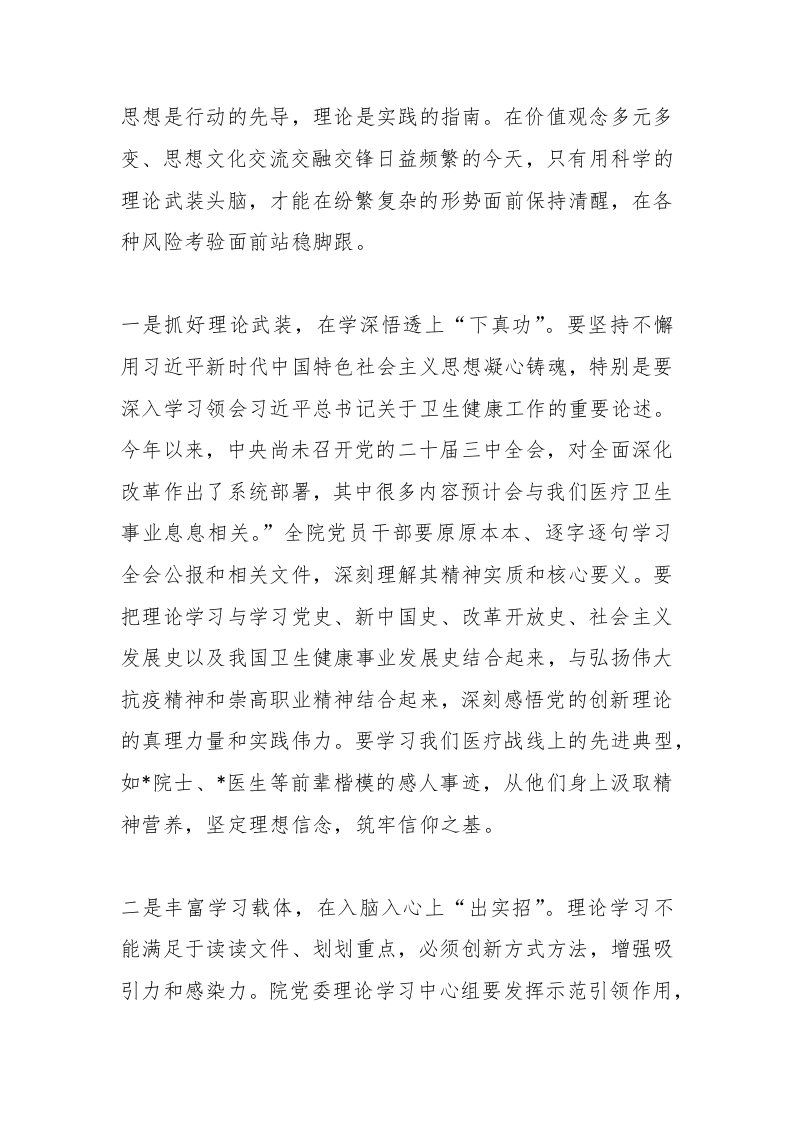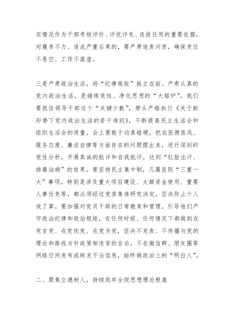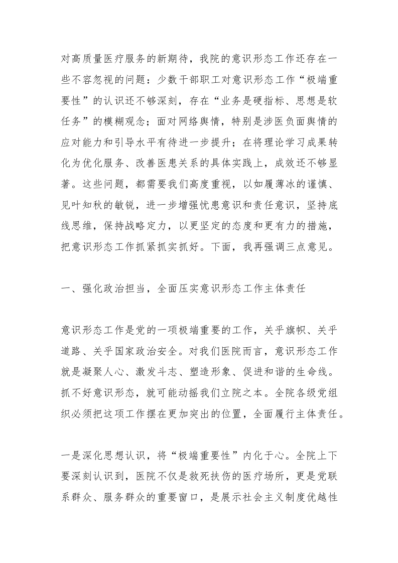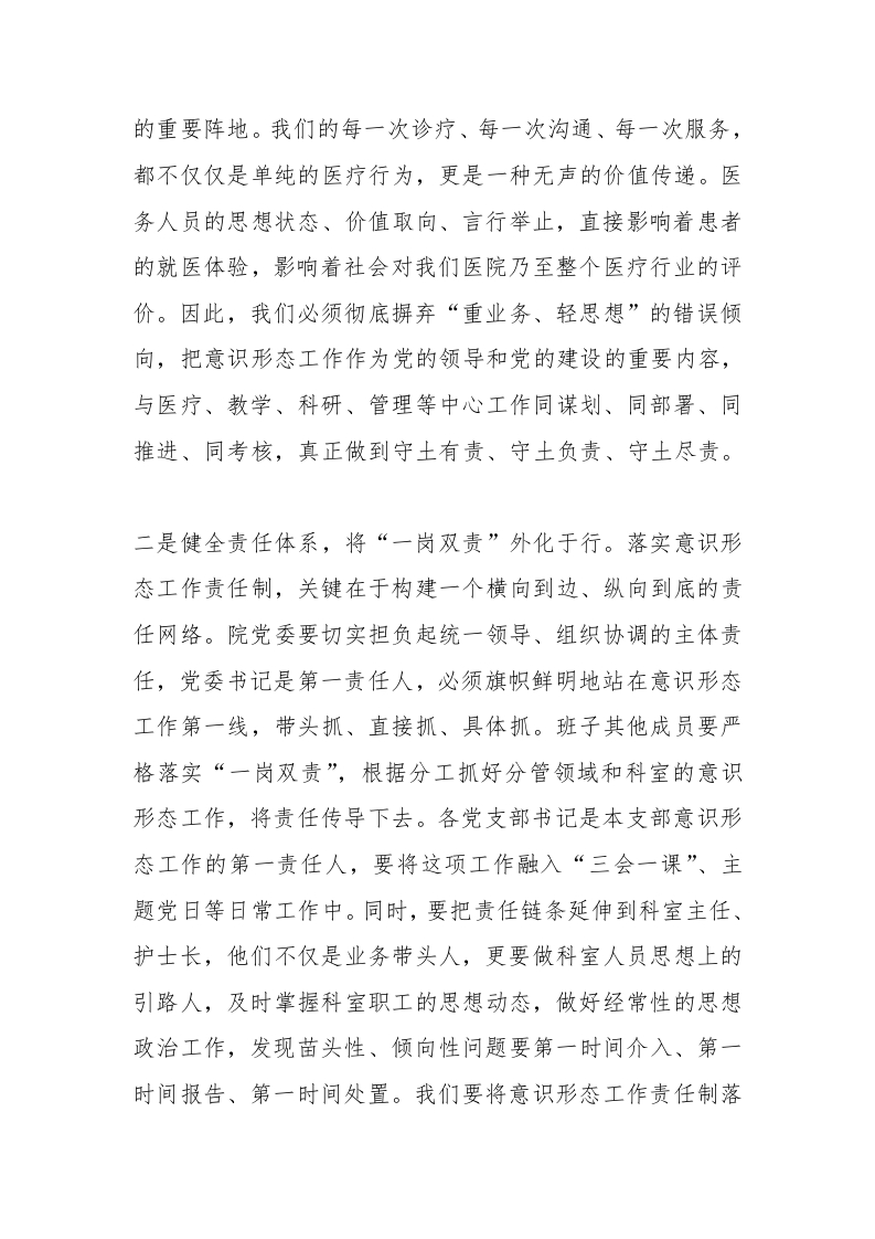对高质量医疗服务的新期待,我院的意识形态工作还存在一些不容忽视的问题:少数干部职工对意识形态工作“极端重要性”的认识还不够深刻,存在“业务是硬指标、思想是软任务”的模糊观念;面对网络舆情,特别是涉医负面舆情的应对能力和引导水平有待进一步提升:在将理论学习成果转化为优化服务、改善医患关系的具体实践上,成效还不够显著。这些问题,都需要我们高度重视,以如履薄冰的谨慎、见叶知秋的敏锐,进一步增强忧患意识和责任意识,坚持底线思维,保持战略定力,以更坚定的态度和更有力的措施,把意识形态工作抓紧抓实抓好。下面,我再强调三点意见。一、强化政治担当,全面压实意识形态工作主体责任意识形态工作是党的一项极端重要的工作,关乎旗帜、关乎道路、关乎国家政治安全。对我们医院而言,意识形态工作就是凝聚人心、激发斗志、塑造形象、促进和谐的生命线。抓不好意识形态,就可能动摇我们立院之本。全院各级党组织必须把这项工作摆在更加突出的位置,全面履行主体责任。一是深化思想认识,将“极端重要性”内化于心。全院上下要深刻认识到,医院不仅是救死扶伤的医疗场所,更是党联系群众、服务群众的重要窗口,是展示社会主义制度优越性