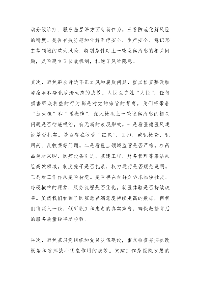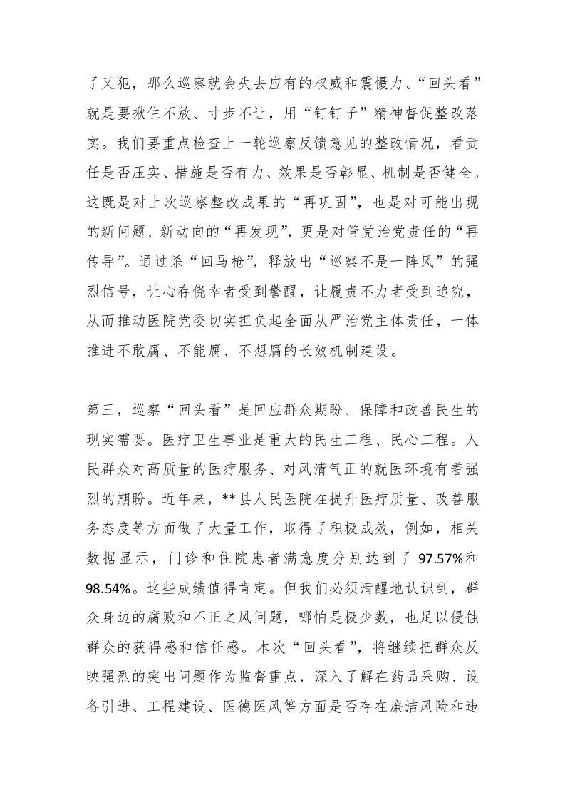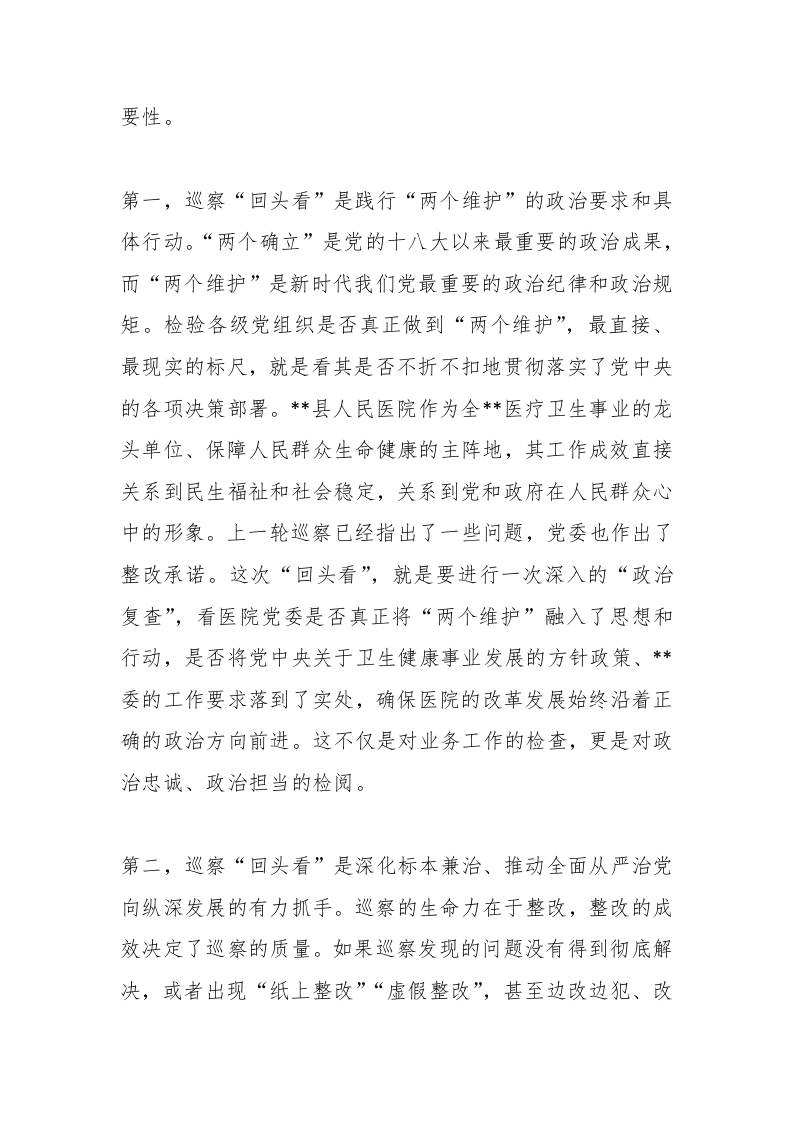 要性。第一,巡察“回头看”是践行“两个维护”的政治要求和具体行动。“两个确立”是党的十八大以来最重要的政治成果,而“两个维护”是新时代我们党最重要的政治纪律和政治规矩。检验各级党组织是否真正做到“两个维护”,最直接、最现实的标尺,就是看其是否不折不扣地贯彻落实了党中央的各项决策部署。*县人民医院作为全**医疗卫生事业的龙头单位、保障人民群众生命健康的主阵地,其工作成效直接关系到民生福祉和社会稳定,关系到党和政府在人民群众心中的形象。上一轮巡察已经指出了一些问题,党委也作出了整改承诺。这次“回头看”,就是要进行一次深入的“政治复查”,看医院党委是否真正将“两个维护”融入了思想和行动,是否将党中央关于卫生健康事业发展的方针政策、**委的工作要求落到了实处,确保医院的改革发展始终沿着正确的政治方向前进。这不仅是对业务工作的检查,更是对政治忠诚、政治担当的检阅。第二,巡察“回头看”是深化标本兼治、推动全面从严治党向纵深发展的有力抓手。巡察的生命力在于整改,整改的成效决定了巡察的质量。如果巡察发现的问题没有得到彻底解决,或者出现“纸上整改”“虚假整改”,甚至边改边犯、改