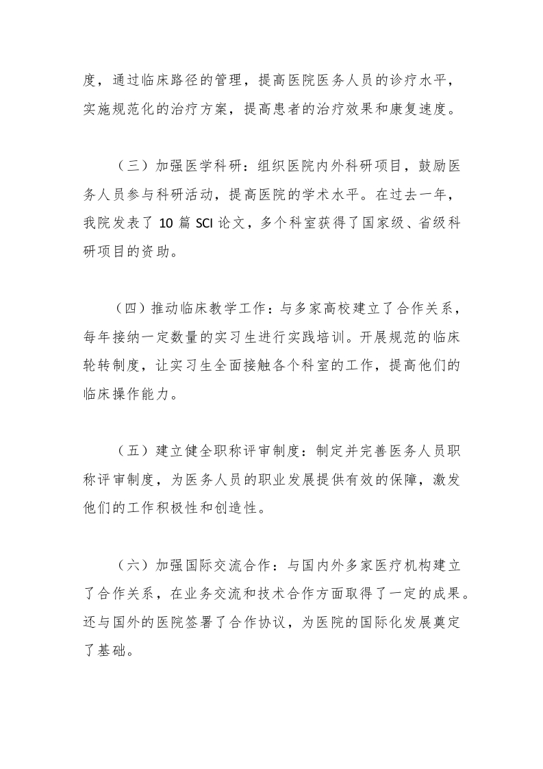 度,通过临床路径的管理,提高医院医务人员的诊疗水平,实施规范化的治疗方案,提高患者的治疗效果和康复速度。(三)加强医学科研:组织医院内外科研项目,鼓励医务人员参与科研活动,提高医院的学术水平。在过去一年,我院发表了10篇SC论文,多个科室获得了国家级、省级科研项目的资助。(四)推动临床教学工作:与多家高校建立了合作关系,每年接纳一定数量的实习生进行实践培训。开展规范的临床轮转制度,让实习生全面接触各个科室的工作,提高他们的临床操作能力。(五)建立健全职称评审制度:制定并完善医务人员职称评审制度,为医务人员的职业发展提供有效的保障,激发他们的工作积极性和创造性。(六)加强国际交流合作:与国内外多家医疗机构建立了合作关系,在业务交流和技术合作方面取得了一定的成果。还与国外的医院签署了合作协议,为医院的国际化发展奠定了基础。