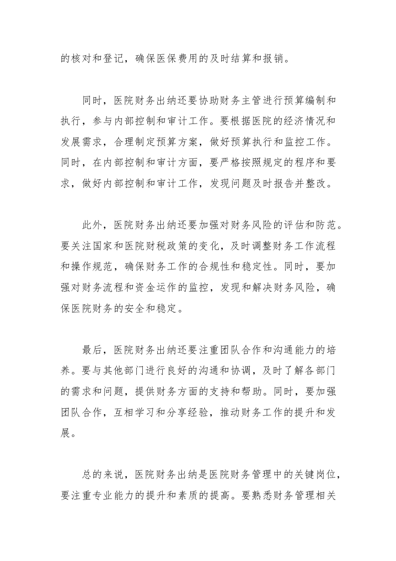的核对和登记,确保医保费用的及时结算和报销。同时,医院财务出纳还要协助财务主管进行预算编制和执行,参与内部控制和审计工作。要根据医院的经济情况和发展需求,合理制定预算方案,做好预算执行和监控工作。同时,在内部控制和审计方面,要严格按照规定的程序和要求,做好内部控制和审计工作,发现问题及时报告并整改。此外,医院财务出纳还要加强对财务风险的评估和防范。要关注国家和医院财税政策的变化,及时调整财务工作流程和操作规范,确保财务工作的合规性和稳定性。同时,要加强对财务流程和资金运作的监控,发现和解决财务风险,确保医院财务的安全和稳定。最后,医院财务出纳还要注重团队合作和沟通能力的培养。要与其他部门进行良好的沟通和协调,及时了解各部门的需求和问题,提供财务方面的支持和帮助。同时,要加强团队合作,互相学习和分享经验,推动财务工作的提升和发展。总的来说,医院财务出纳是医院财务管理中的关键岗位,要注重专业能力的提升和素质的提高。要熟悉财务管理相关