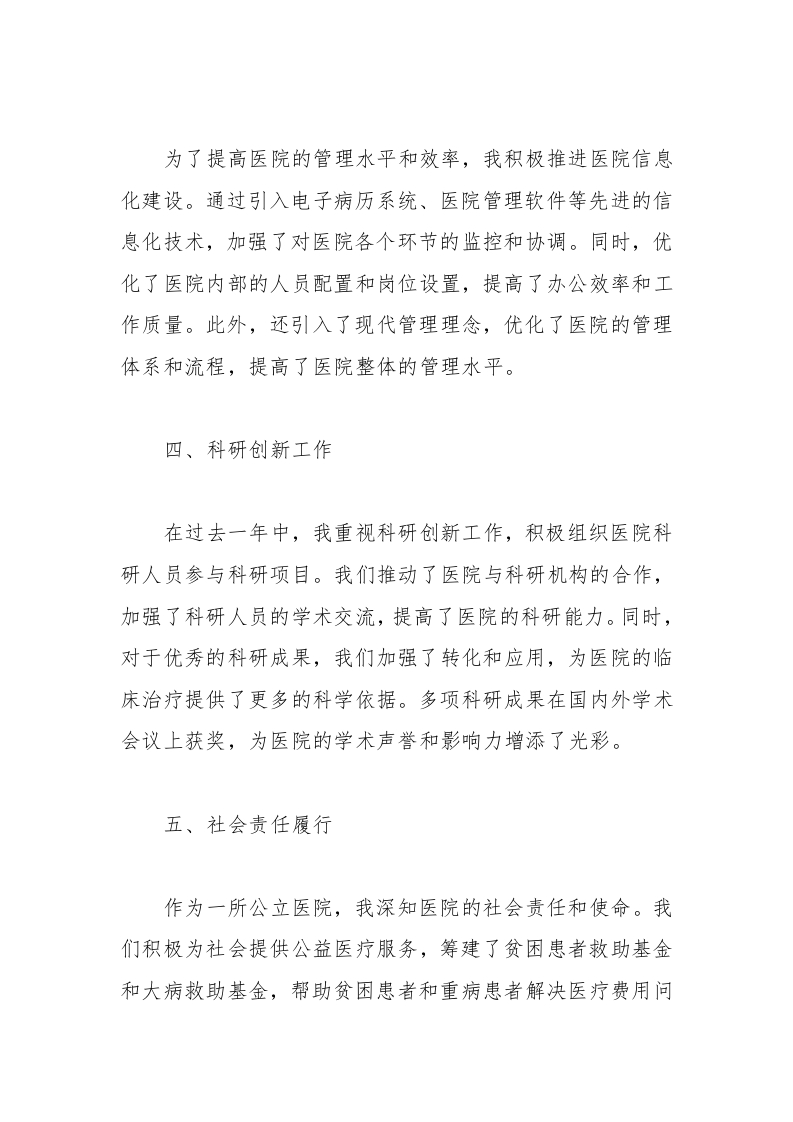 为了提高医院的管理水平和效率,我积极推进医院信息化建设。通过引入电子病历系统、医院管理软件等先进的信息化技术,加强了对医院各个环节的监控和协调。同时,优化了医院内部的人员配置和岗位设置,提高了办公效率和工作质量。此外,还引入了现代管理理念,优化了医院的管理体系和流程,提高了医院整体的管理水平。四、科研创新工作在过去一年中,我重视科研创新工作,积极组织医院科研人员参与科研项目。我们推动了医院与科研机构的合作,加强了科研人员的学术交流,提高了医院的科研能力。同时,对于优秀的科研成果,我们加强了转化和应用,为医院的临床治疗提供了更多的科学依据。多项科研成果在国内外学术会议上获奖,为医院的学术声誉和影响力增添了光彩。五、社会责任履行作为一所公立医院,我深知医院的社会责任和使命。我们积极为社会提供公益医疗服务,筹建了贫困患者救助基金和大病救助基金,帮助贫困患者和重病患者解决医疗费用问