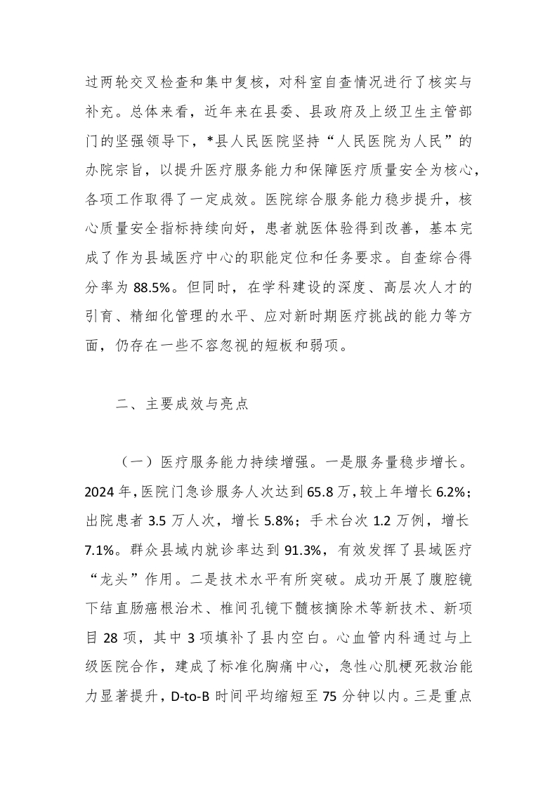过两轮交叉检查和集中复核,对科室自查情况进行了核实与补充。总体来看,近年来在县委、县政府及上级卫生主管部门的坚强领导下,*县人民医院坚持“人民医院为人民”的办院宗旨,以提升医疗服务能力和保障医疗质量安全为核心,各项工作取得了一定成效。医院综合服务能力稳步提升,核心质量安全指标持续向好,患者就医体验得到改善,基本完成了作为县域医疗中心的职能定位和任务要求。自查综合得分率为88.5%。但同时,在学科建设的深度、高层次人才的引育、精细化管理的水平、应对新时期医疗挑战的能力等方面,仍存在一些不容忽视的短板和弱项。二、主要成效与亮点(一)医疗服务能力持续增强。一是服务量稳步增长。2024年,医院门急诊服务人次达到65.8万,较上年增长6.2%:出院患者3.5万人次,增长5.8%;手术台次1.2万例,增长7.1%。群众县域内就诊率达到91.3%,有效发挥了县域医疗“龙头”作用。二是技术水平有所突破。成功开展了腹腔镜下结直肠癌根治术、椎间孔镜下髓核摘除术等新技术、新项目28项,其中3项填补了县内空白。心血管内科通过与上级医院合作,建成了标准化胸痛中心,急性心肌梗死救治能力显著提升,D-to-B时间平均缩短至75分钟以内。三是重点