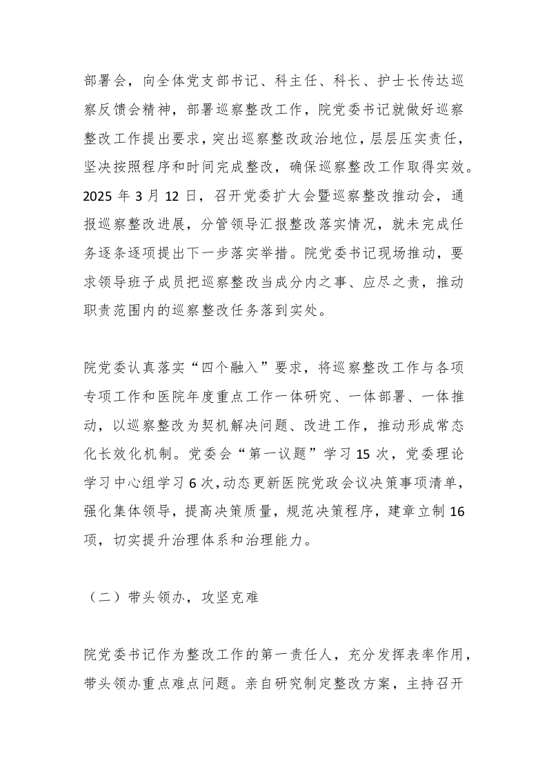 部署会,向全体党支部书记、科主任、科长、护士长传达巡察反馈会精神,部署巡察整改工作,院党委书记就做好巡察整改工作提出要求,突出巡察整改政治地位,层层压实责任,坚决按照程序和时间完成整改,确保巡察整改工作取得实效。2025年3月12日,召开党委扩大会暨巡察整改推动会,通报巡察整改进展,分管领导汇报整改落实情况,就未完成任务逐条逐项提出下一步落实举措。院党委书记现场推动,要求领导班子成员把巡察整改当成分内之事、应尽之责,推动职责范围内的巡察整改任务落到实处。院党委认真落实“四个融入”要求,将巡察整改工作与各项专项工作和医院年度重点工作一体研究、一体部署、一体推动,以巡察整改为契机解决问题、改进工作,推动形成常态化长效化机制。党委会“第一议题”学习15次,党委理论学习中心组学习6次,动态更新医院党政会议决策事项清单,强化集体领导,提高决策质量,规范决策程序,建章立制16项,切实提升治理体系和治理能力。(二)带头领办,攻坚克难院党委书记作为整改工作的第一责任人,充分发挥表率作用,带头领办重点难点问题。亲自研究制定整改方案,主持召开